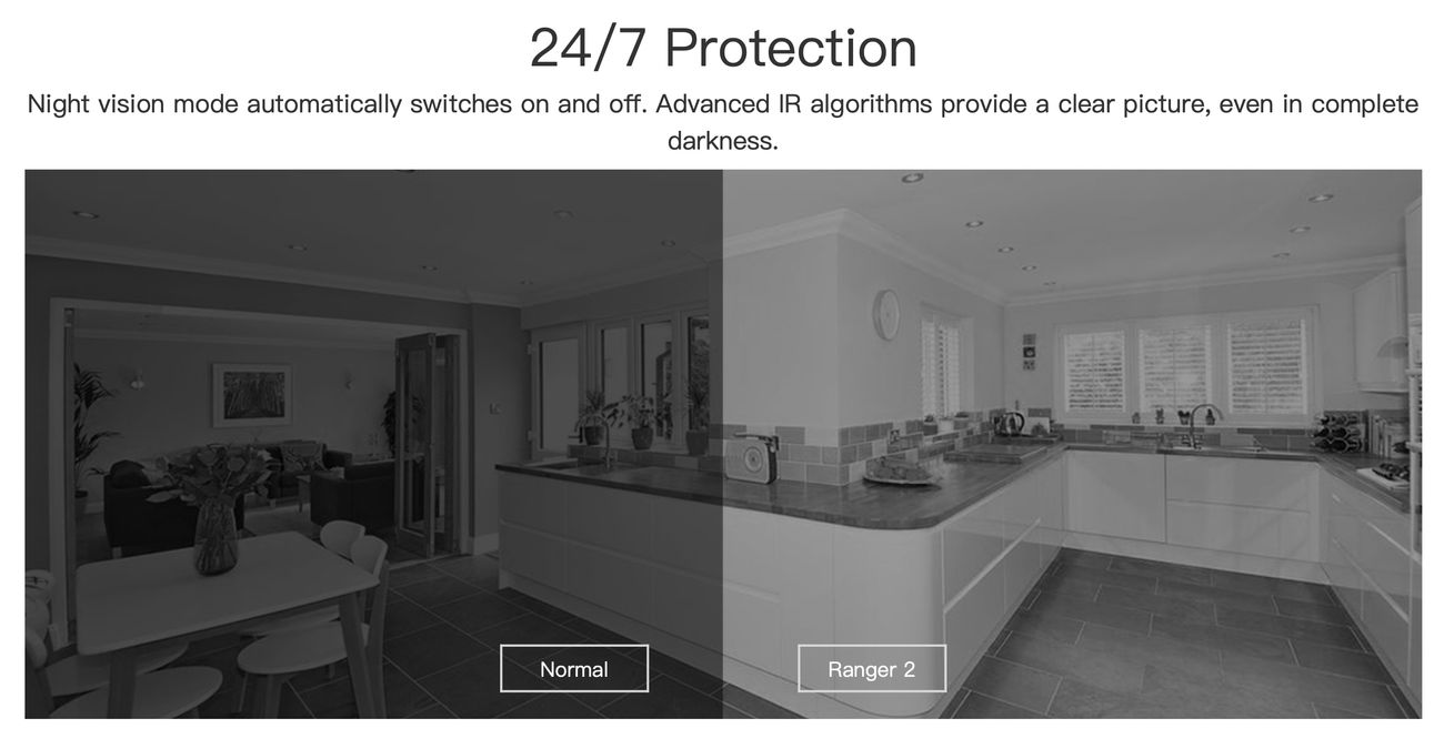 - 24/7 Protection Night vision mode automatically switches on and off. Advanced IR algorithms provide clear picture even in complete darkness.