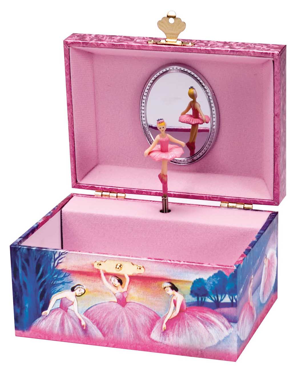 When the box is opened .. a ballerina doll spins to the tune of "Swan Lake."