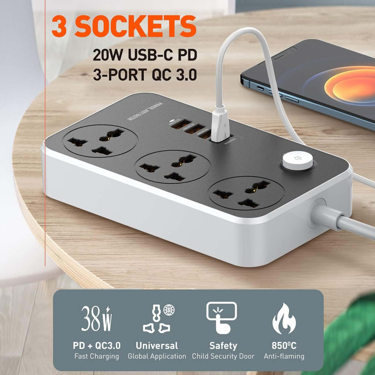 A useful adapter with 3 international outlets, meaning it's a power strip that can accommodate various plug types.