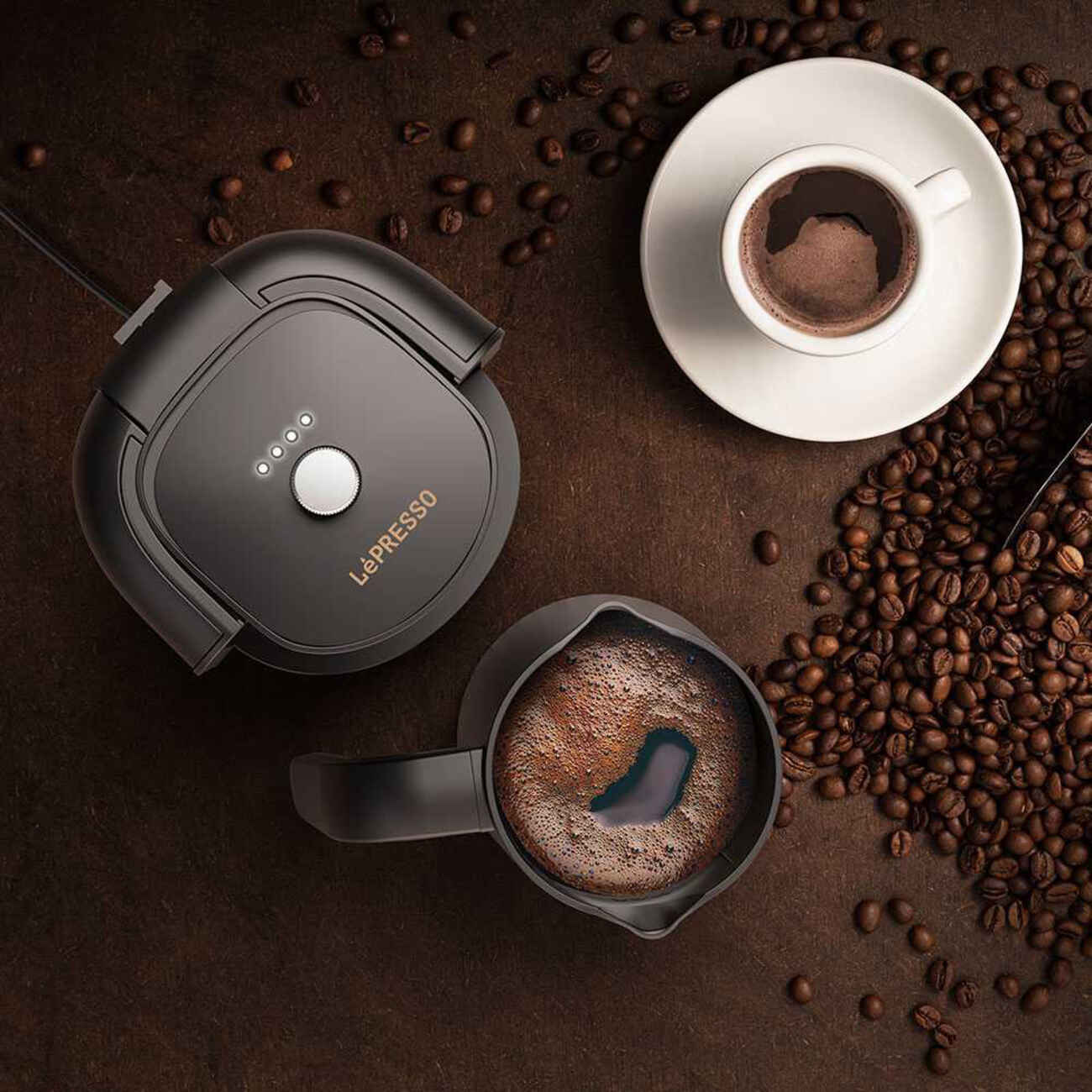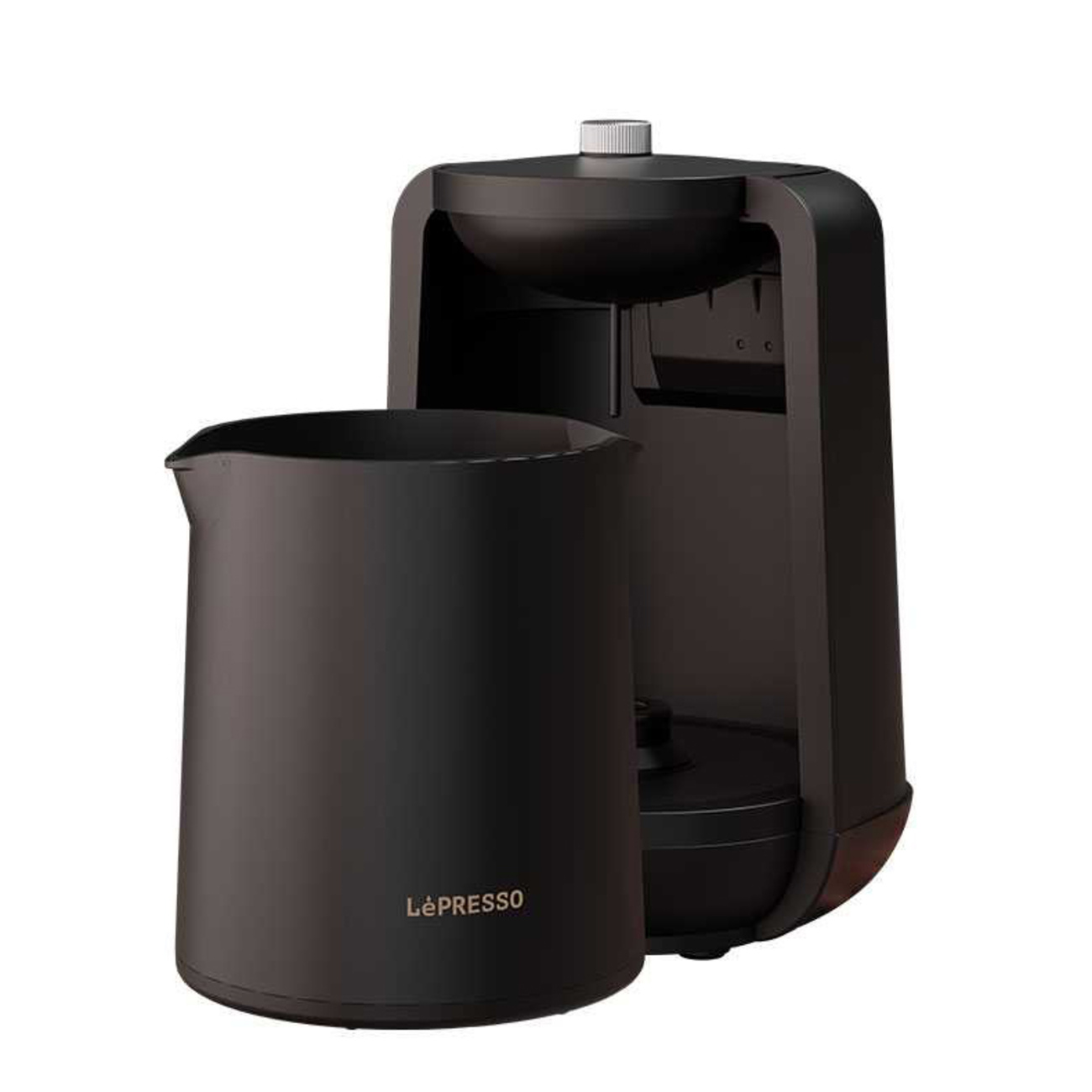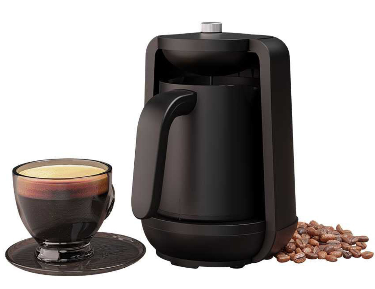 Enjoy a traditional Turkish coffee experience at the touch of a button with LePresso's Turkish Coffee Maker. This elegant and authentic automated coffee maker can prepare up to 4 cups of coffee fast and effortlessly in under a couple of minutes. Its small size, ergonomic design, and fashionable black color make it ideal for use in homes and offices. The big pouring spout and ergonomic, insulated handle make it easy to use. Finally, the coffee maker features an automatic power-off function, which turns off the machine once the coffee is brewed.