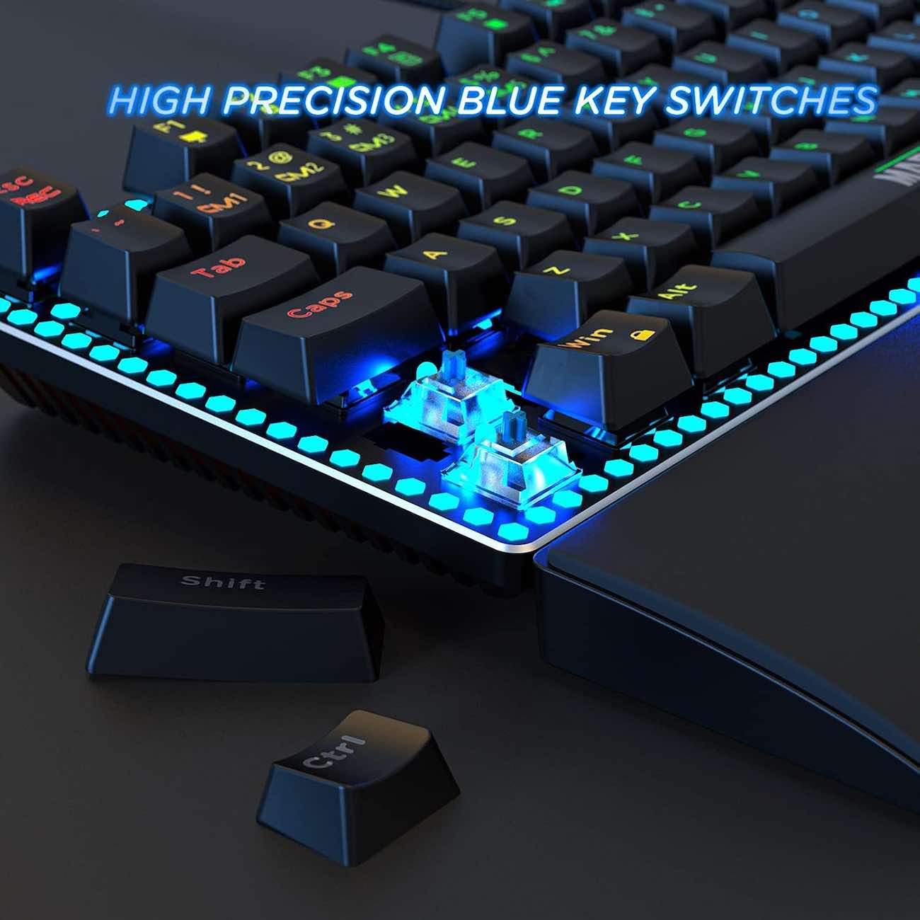The keyboard features blue mechanical switches.