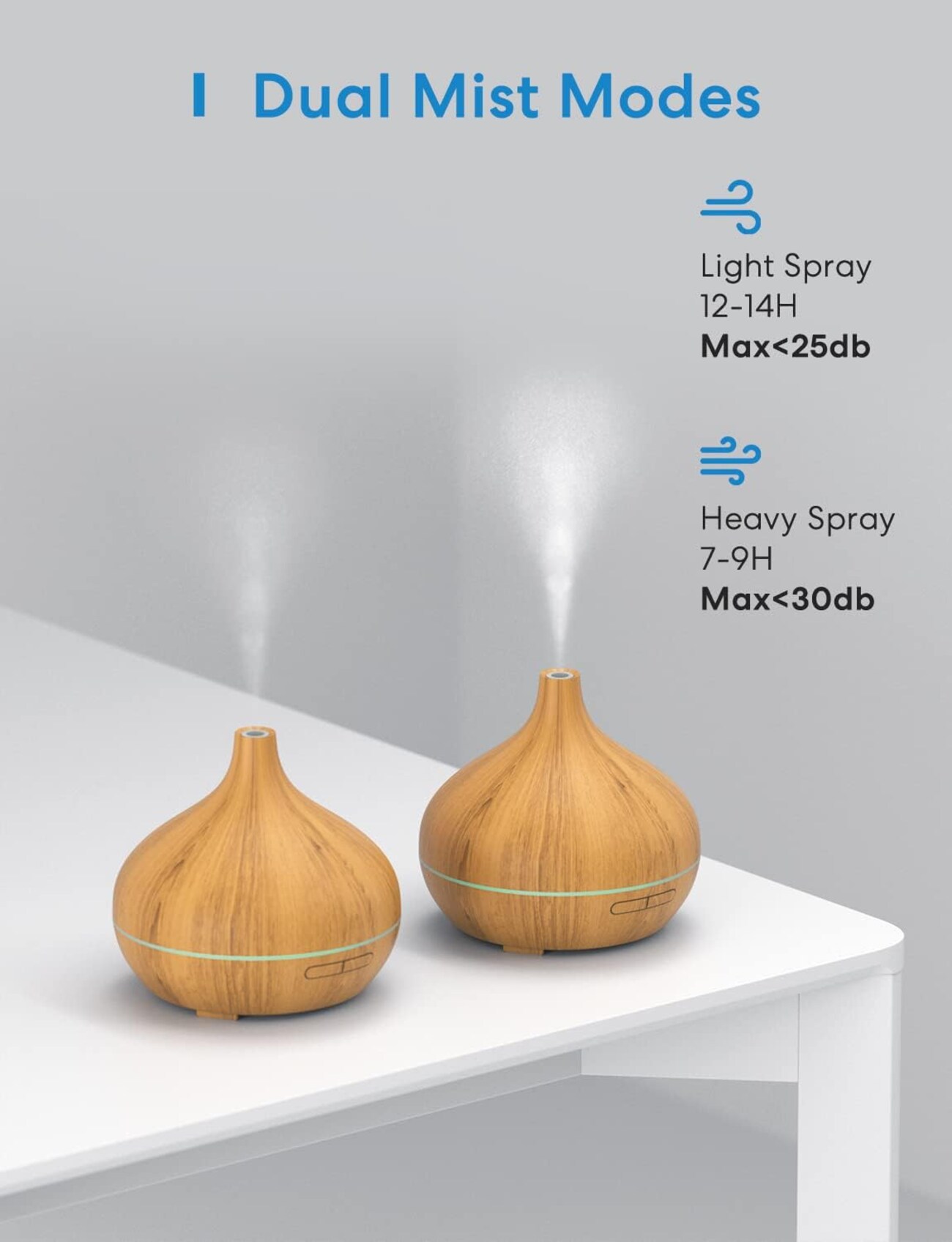 Two mist options are available: strong mist (sufficient for 7-9 hours) or light mist (sufficient for 12-14 hours).