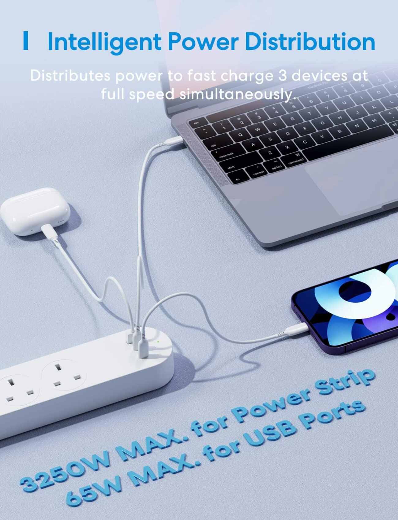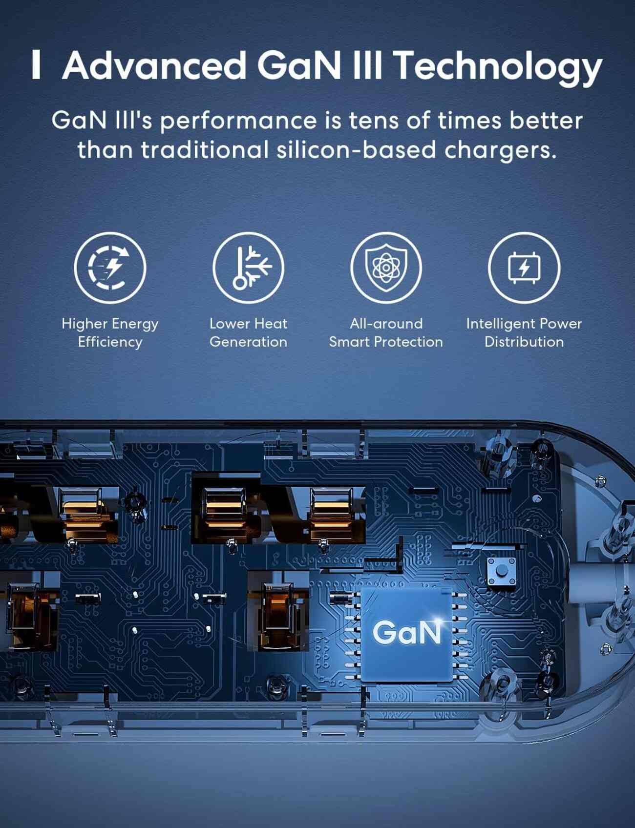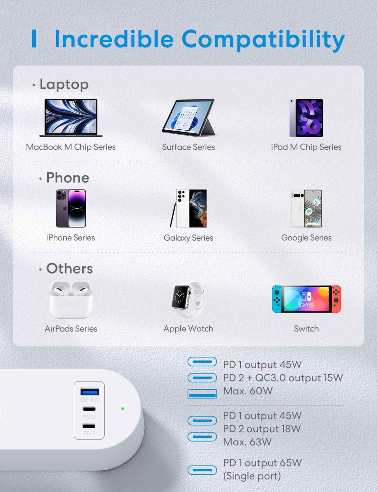 Charging power of up to 65 watts from the USB-C port, with GaN technology for faster and safer charging.