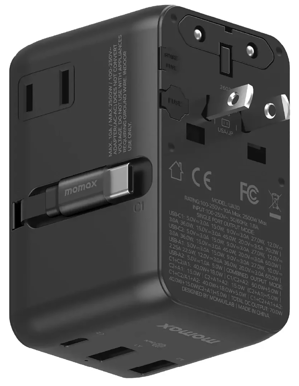 Momax Travel Charger / 2×USB-A + 3×USB-C Ports / 70W / GaN Technology / Worldwide Use / Black