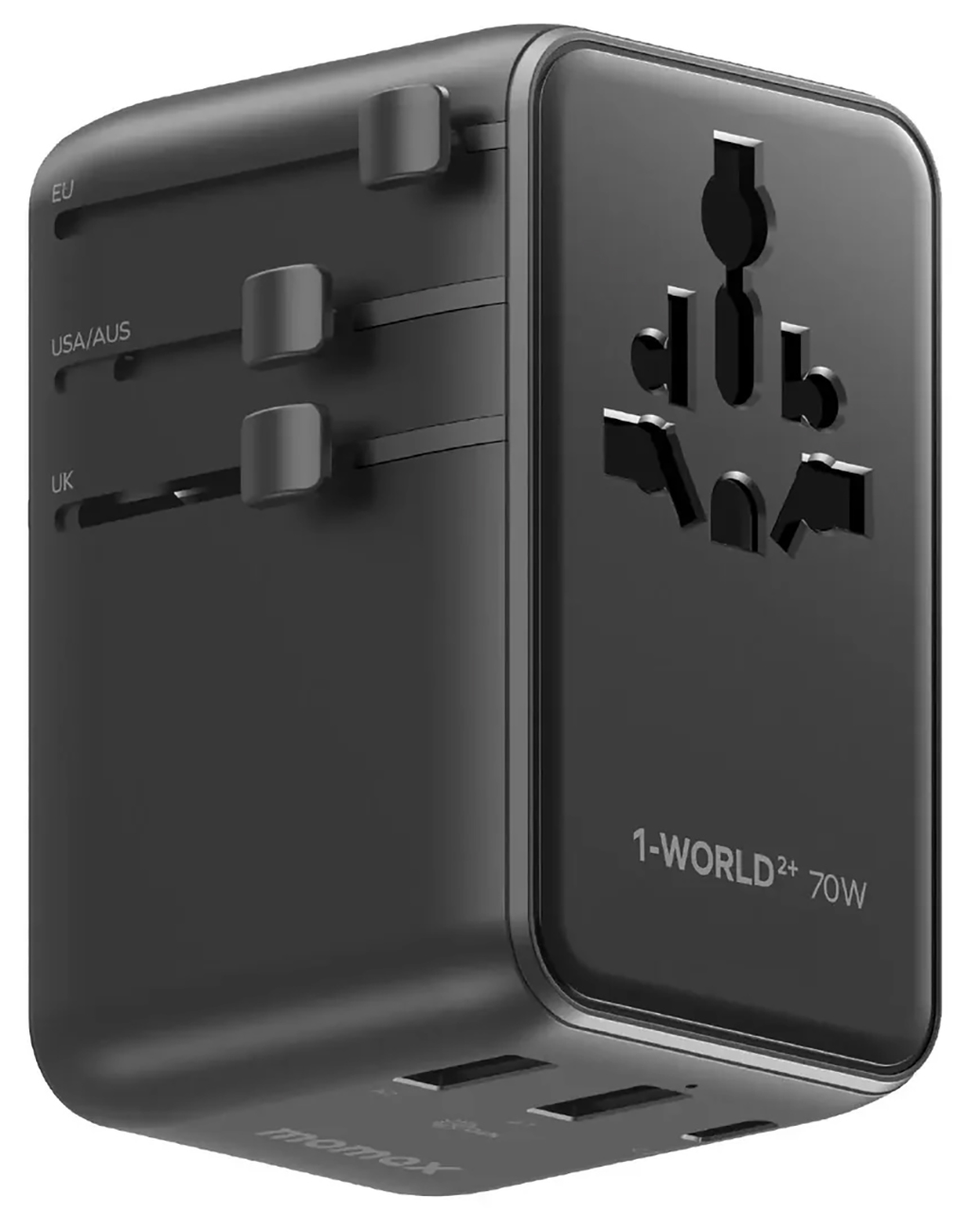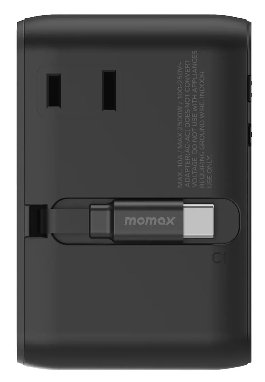 Momax 1-World²⁺ Travel Adapter / 70W GaN / Type-C + 2 USB Ports / Built-in Type-C Cable / Titanium