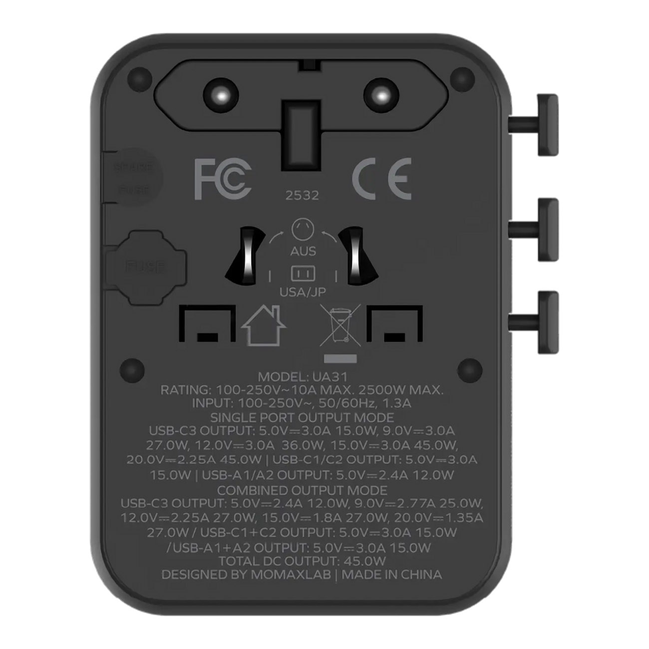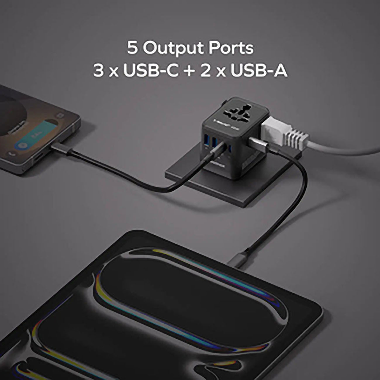 Uses GaN technology for fast charging with 45W power output. Equipped with 5 versatile ports: