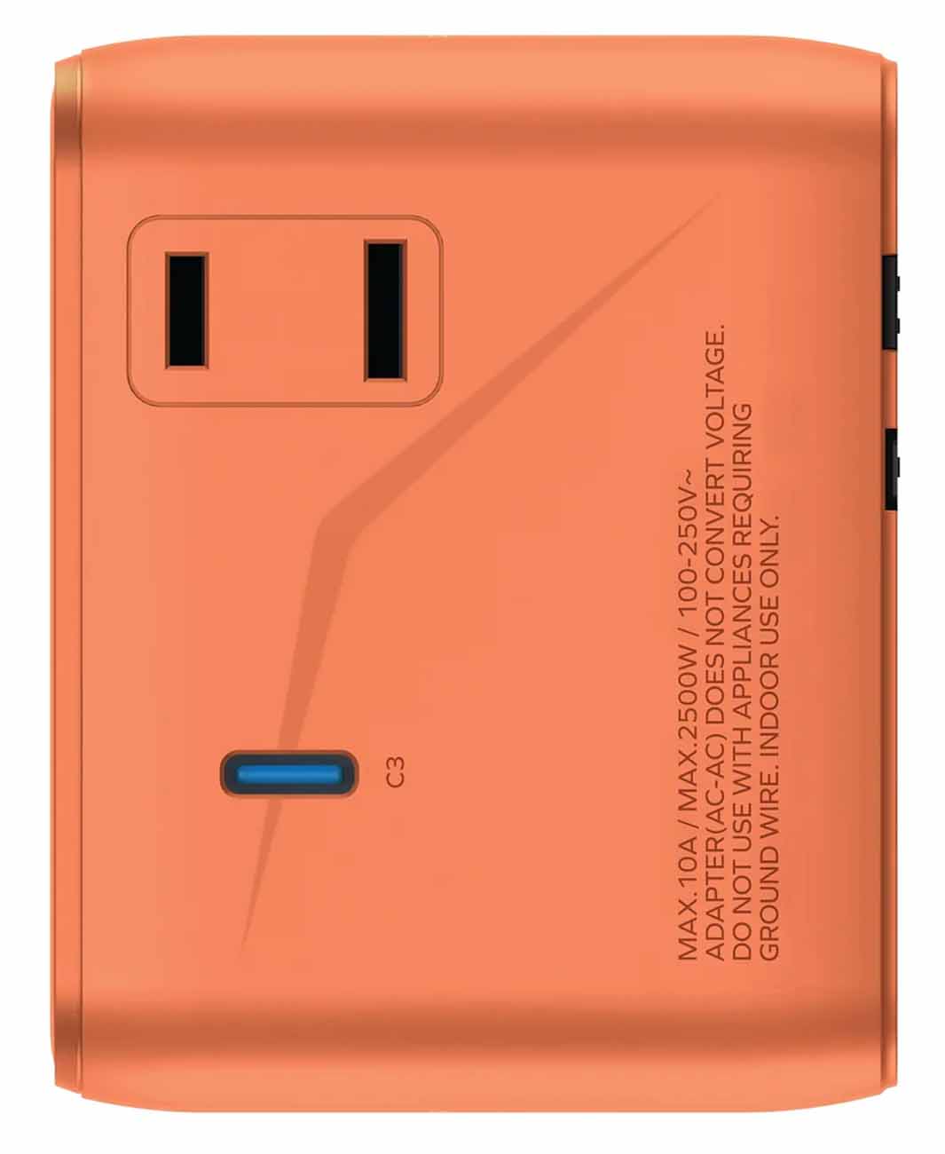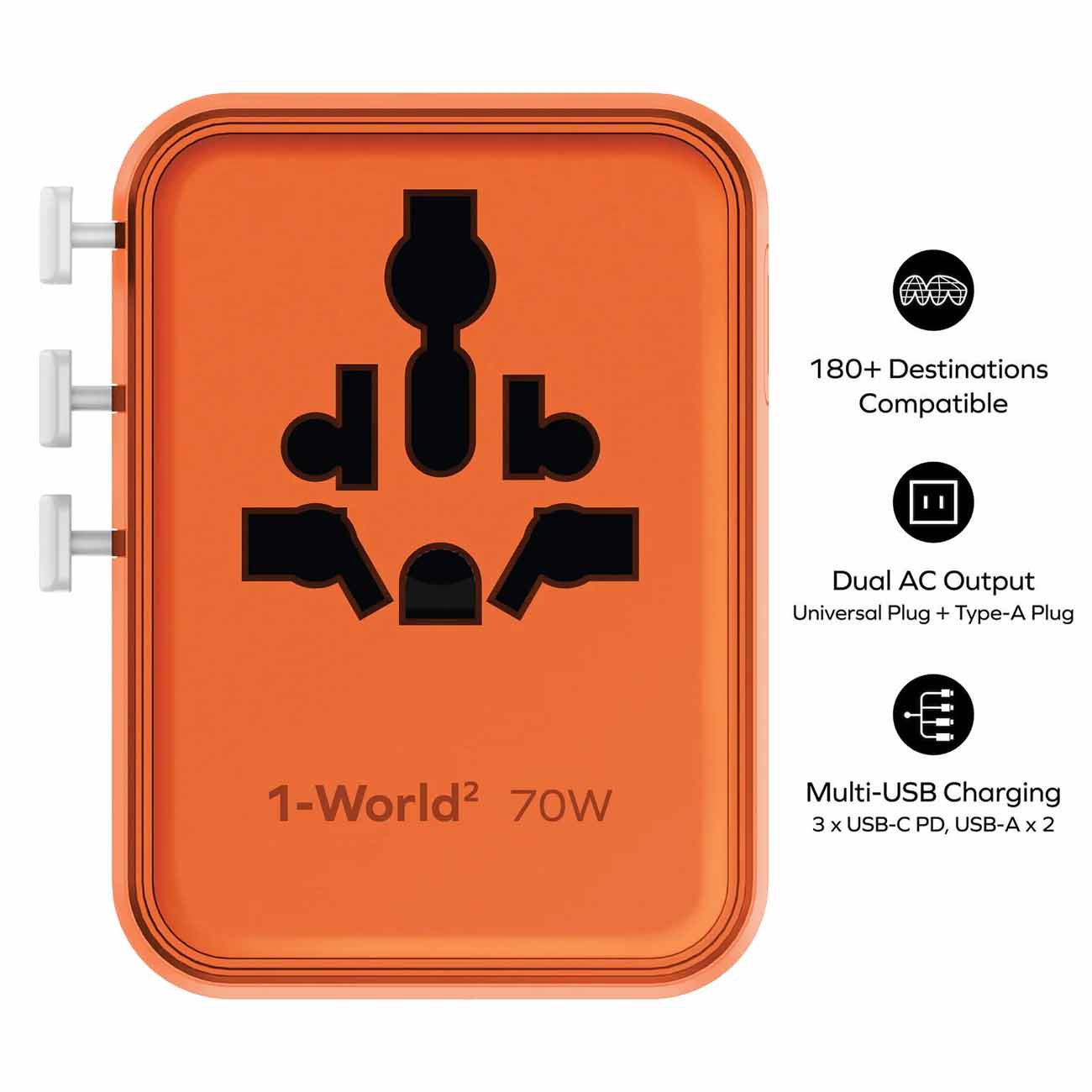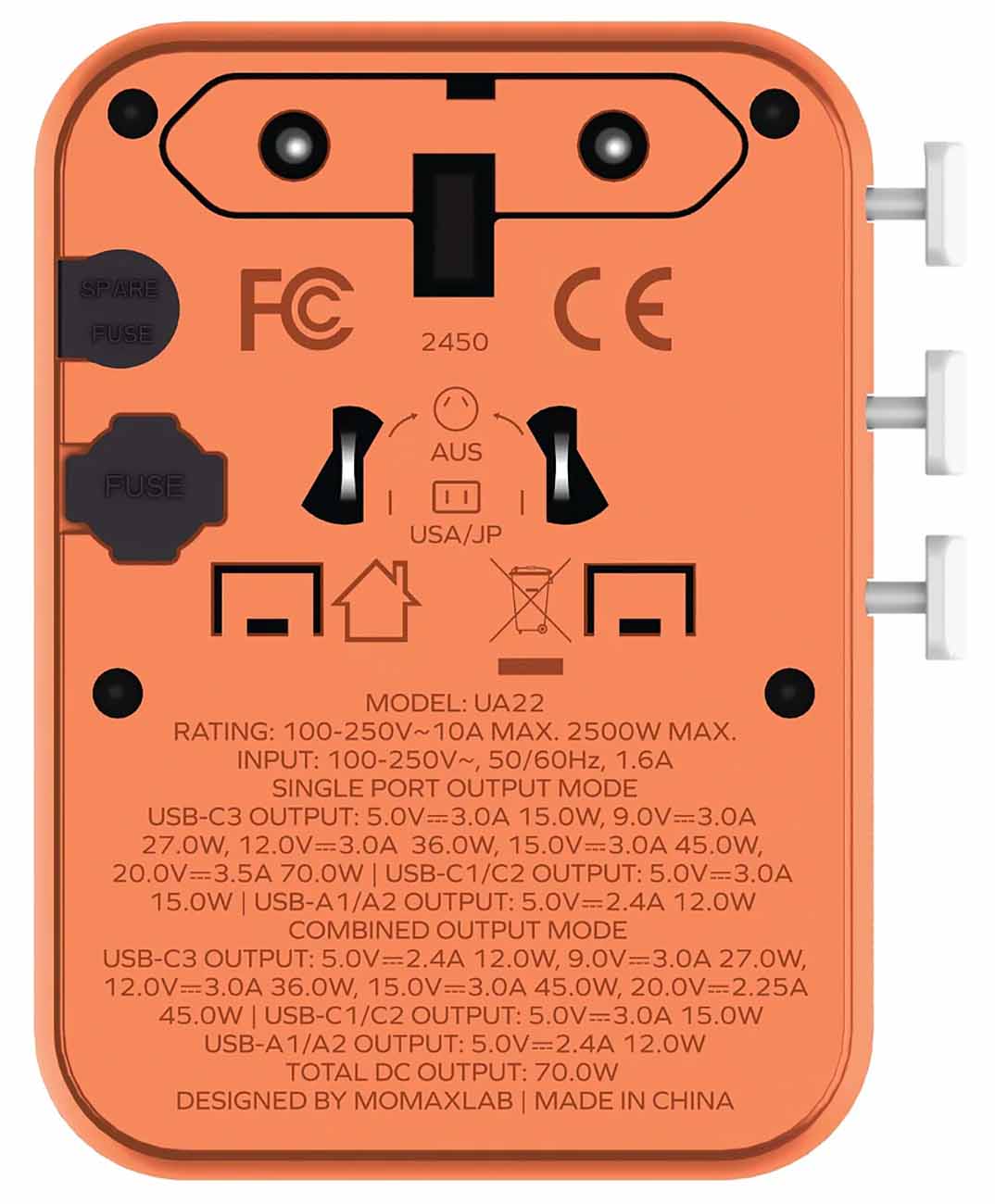 Momax World Charger / 1 Type-C + 2 USB Ports / 25 Watts / Built-in Type-C Cable / Orange