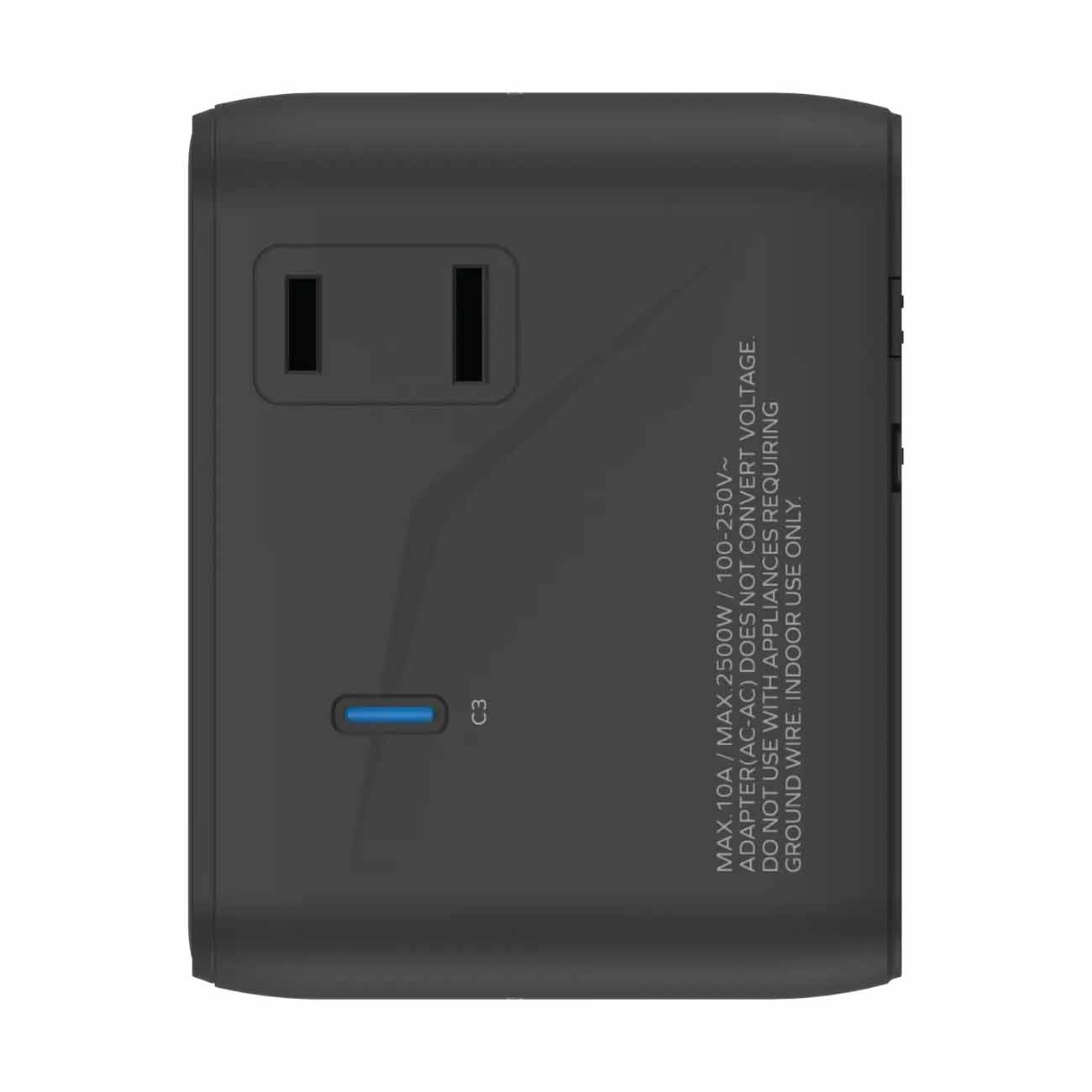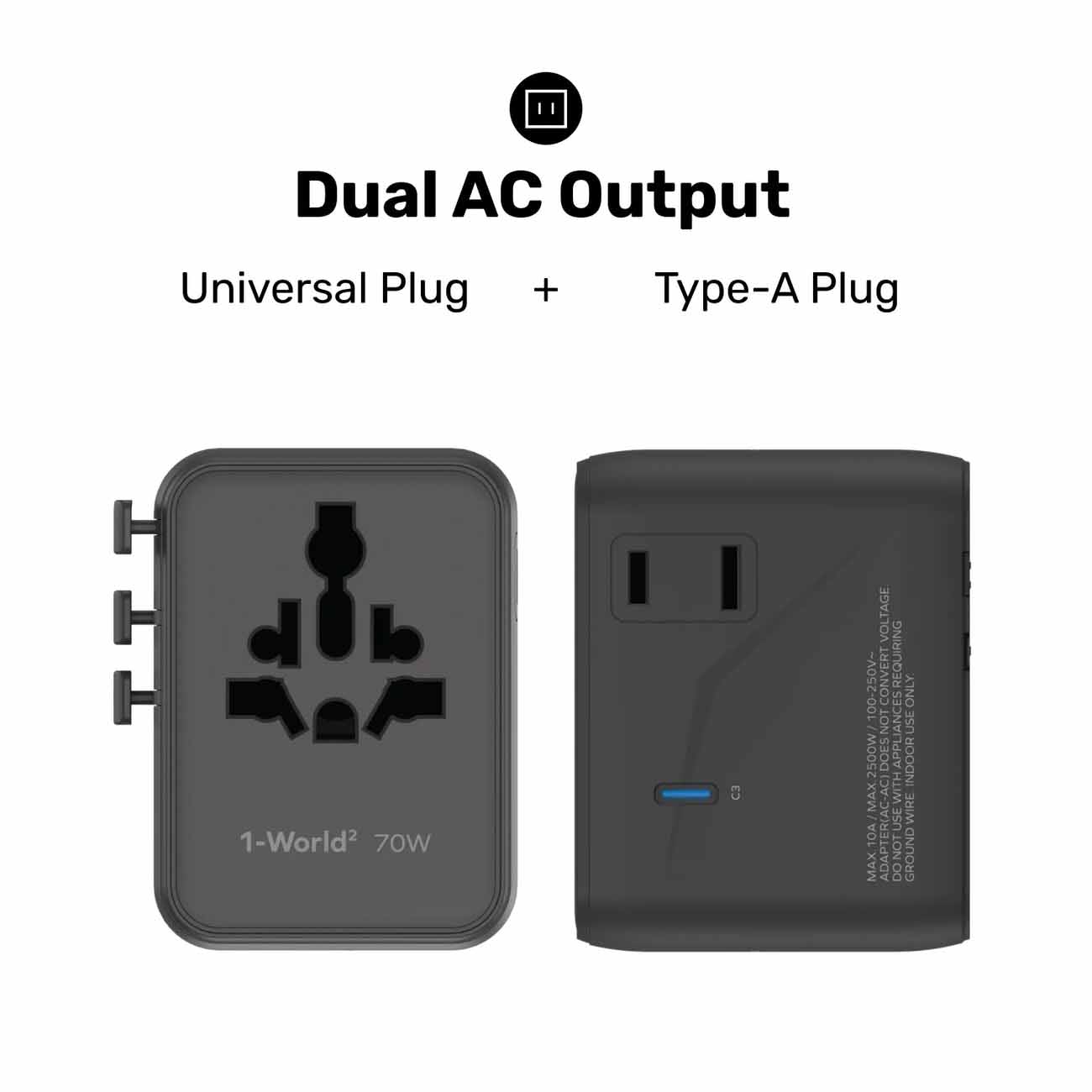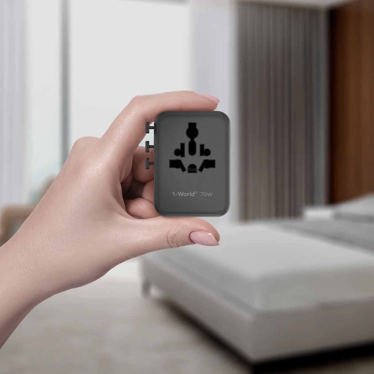 Momax 1-World²⁺ Travel Adapter / 70W GaN / Type-C + 2 USB Ports / Built-in Type-C Cable / Black