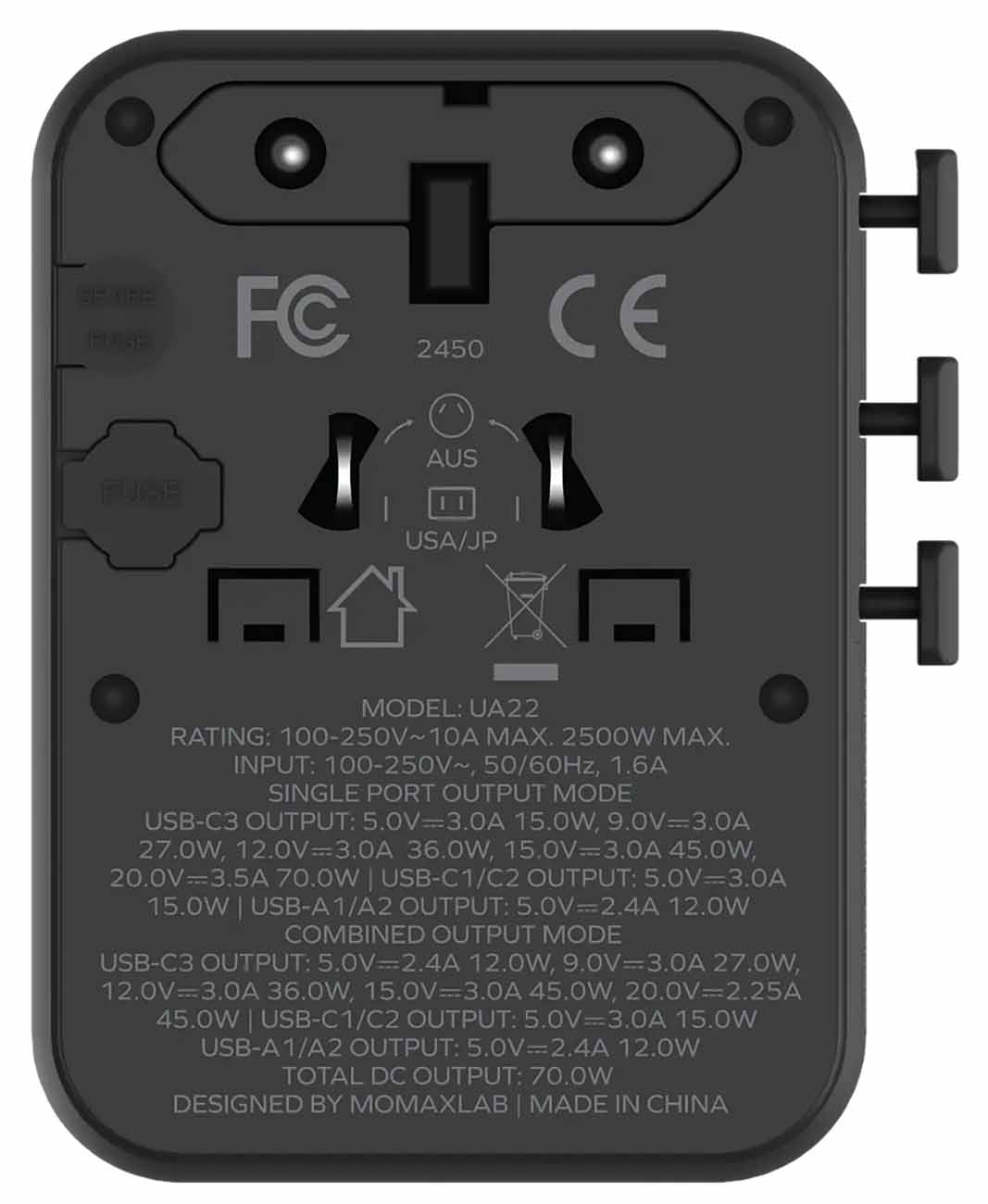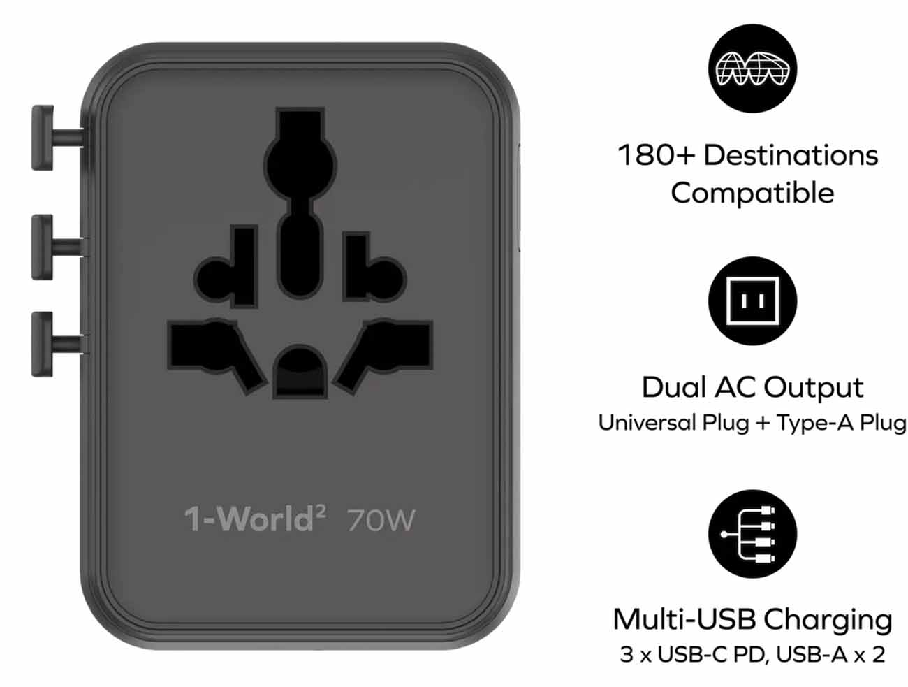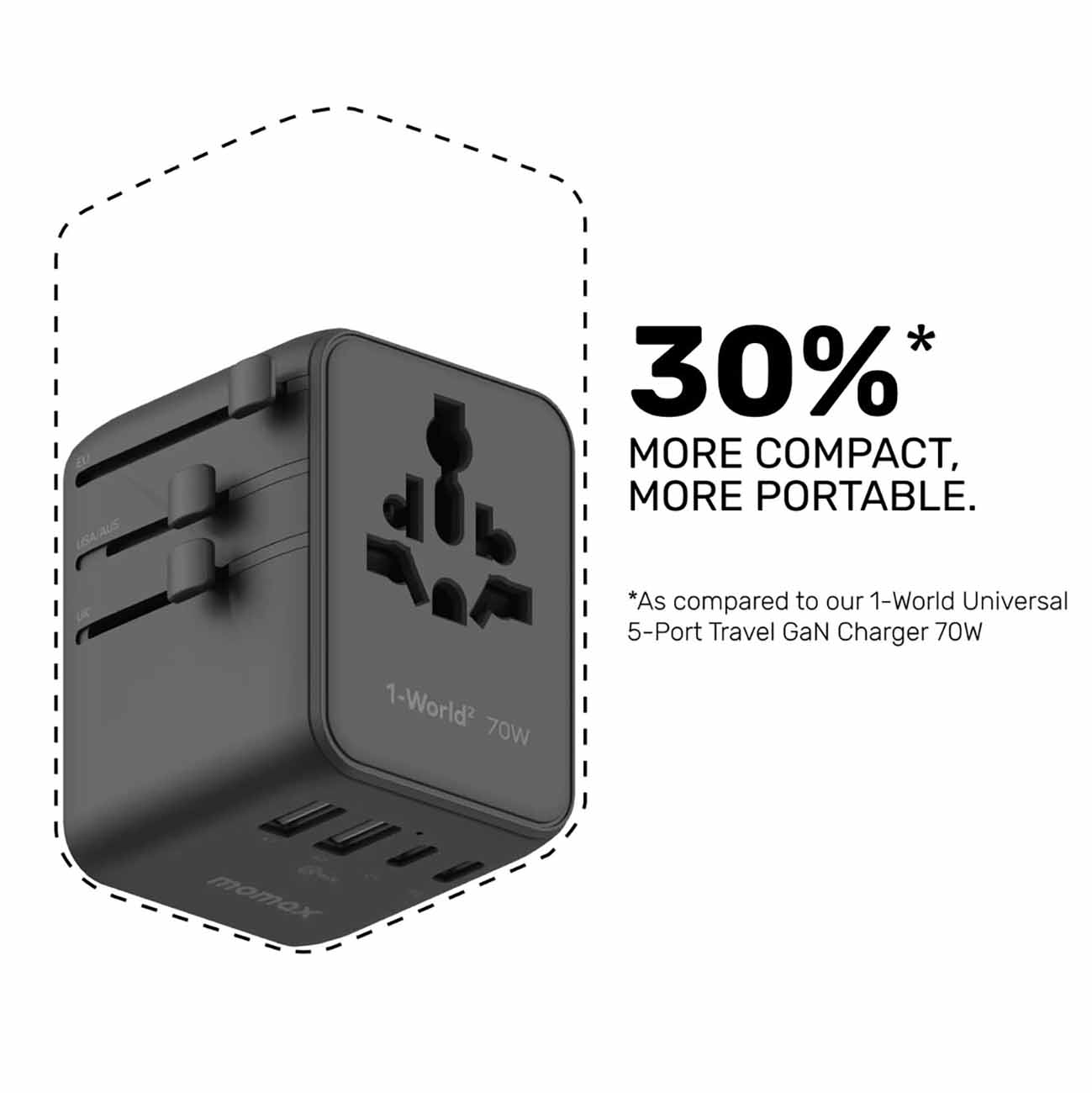 Momax World 2 Travel Adapter / 5 Ports / Supports Over 180 Countries / 70W Power / Titanium