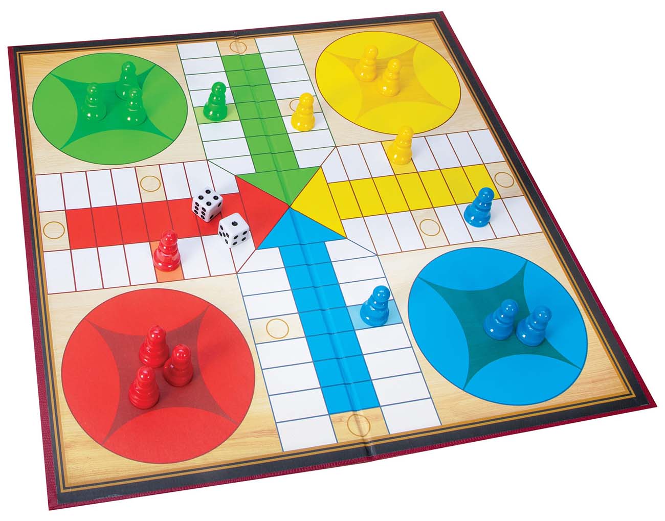Includes the game board .. 16 plastic pieces .. 4 dice .. and an instruction manual.