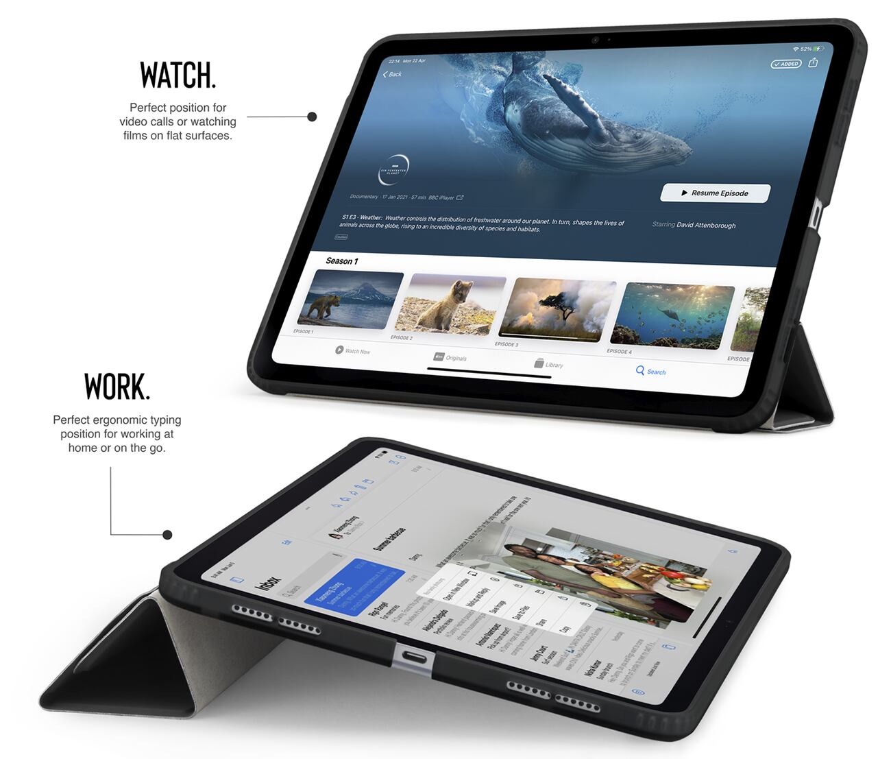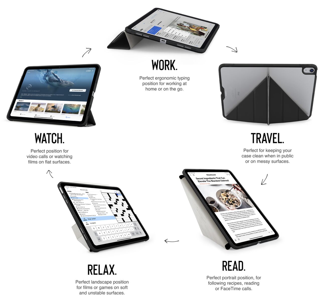 The front cover can be shaped to hold the iPad in portrait or landscape mode at multiple angles for your convenience.