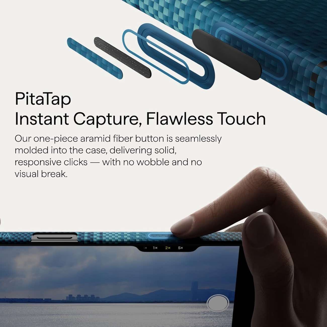 Features PitaTap .. a built-in button on the case that lets you control the camera (take photos or record videos) quickly and easily without touching the screen.