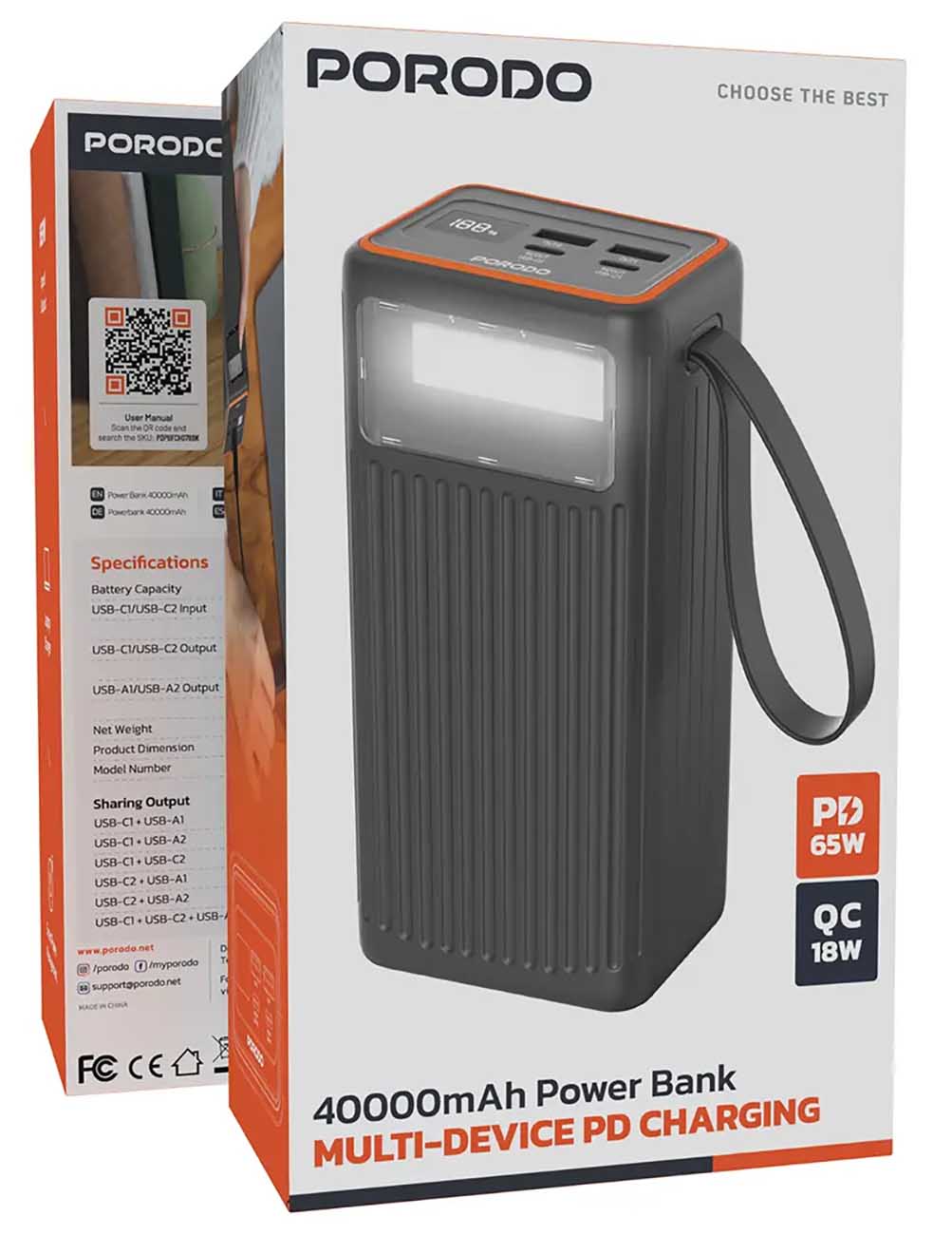 Porodo 50,000 mAh Power Bank / Type-C & 2 USB Ports / Built-in Type-C Cable / 20W Power
