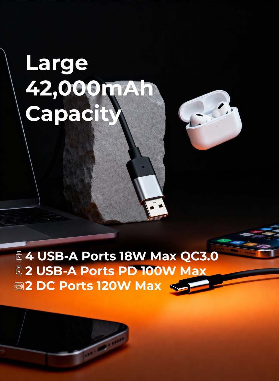 Fast charging via USB-C input (100W) — suitable for laptops and modern devices.