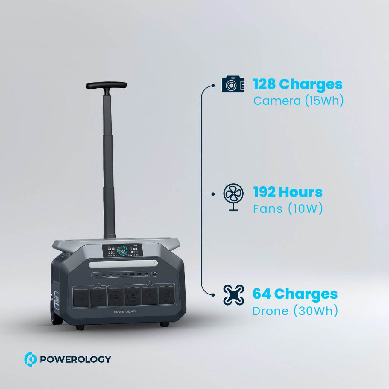 Can charge a camera up to 128 times .. a fan 192 times .. and a drone 64 times.