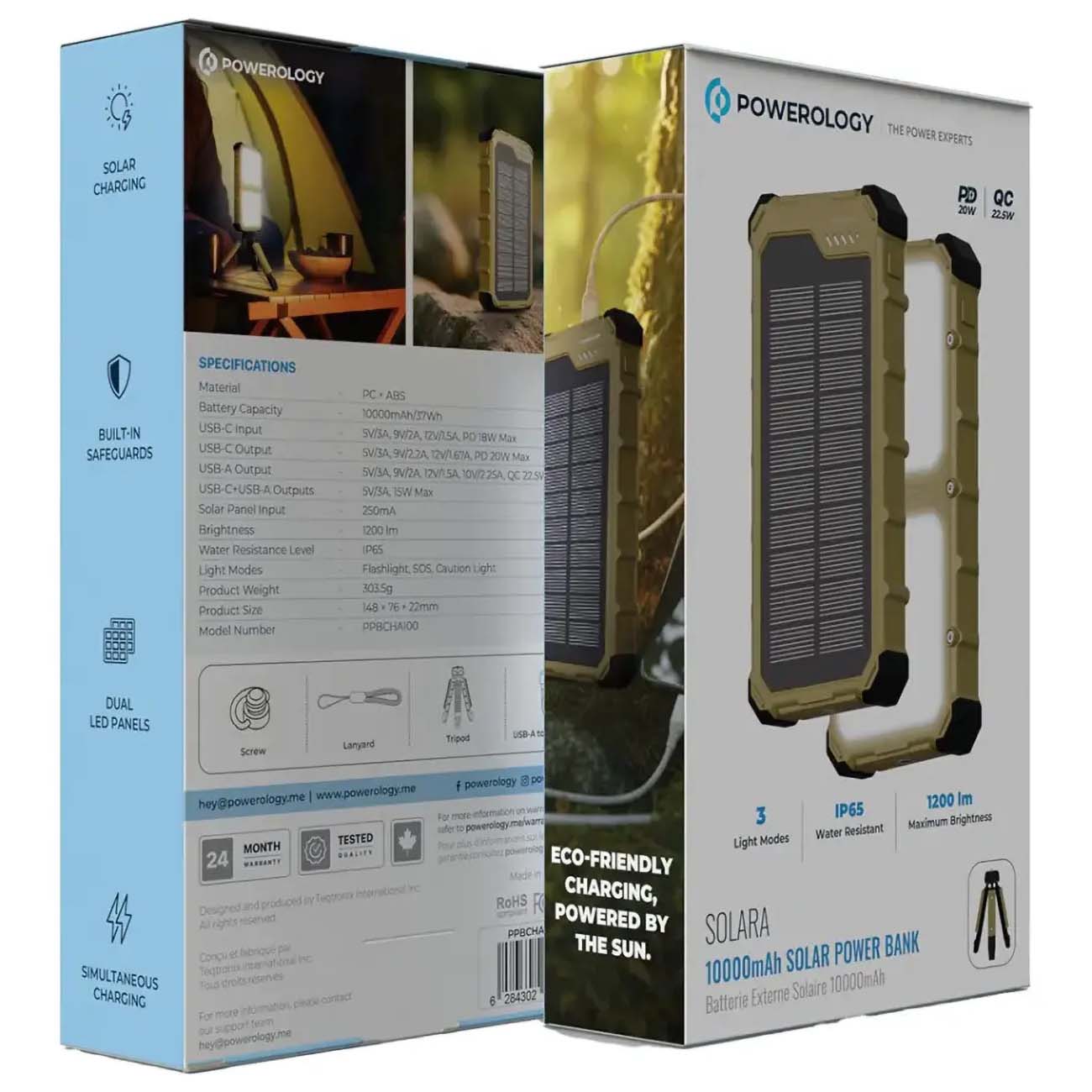 Powerology 10,000mAh Power Bank / Type-C & USB-A Ports / Solar Charging / Detachable Flashlight