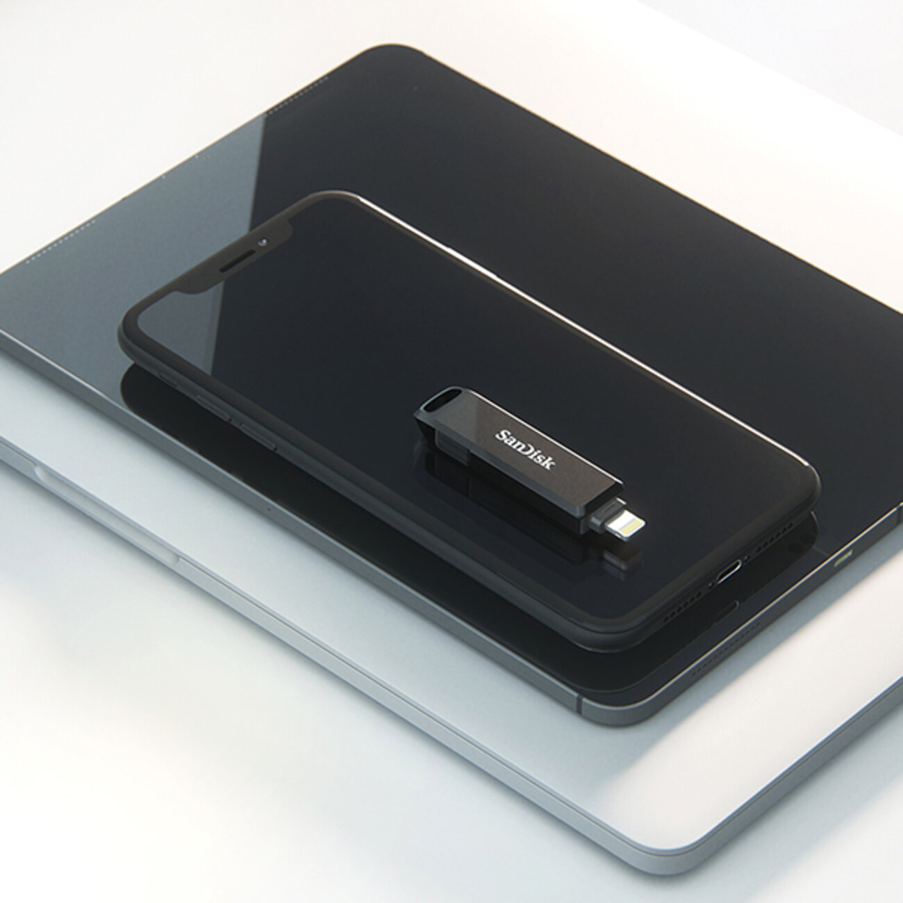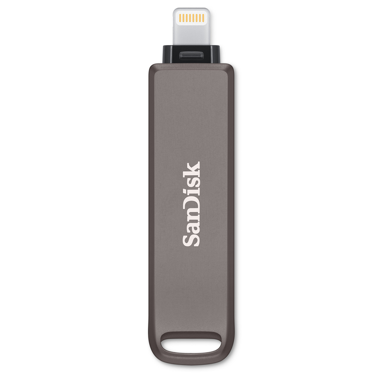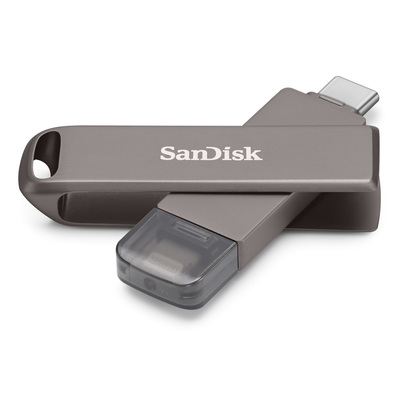 All-metal casing 2-in-1 flash drive with Lightning and USB Type-C connectors.