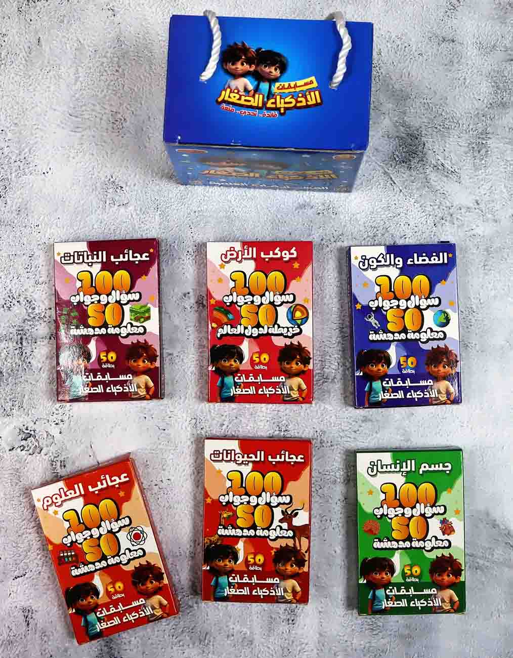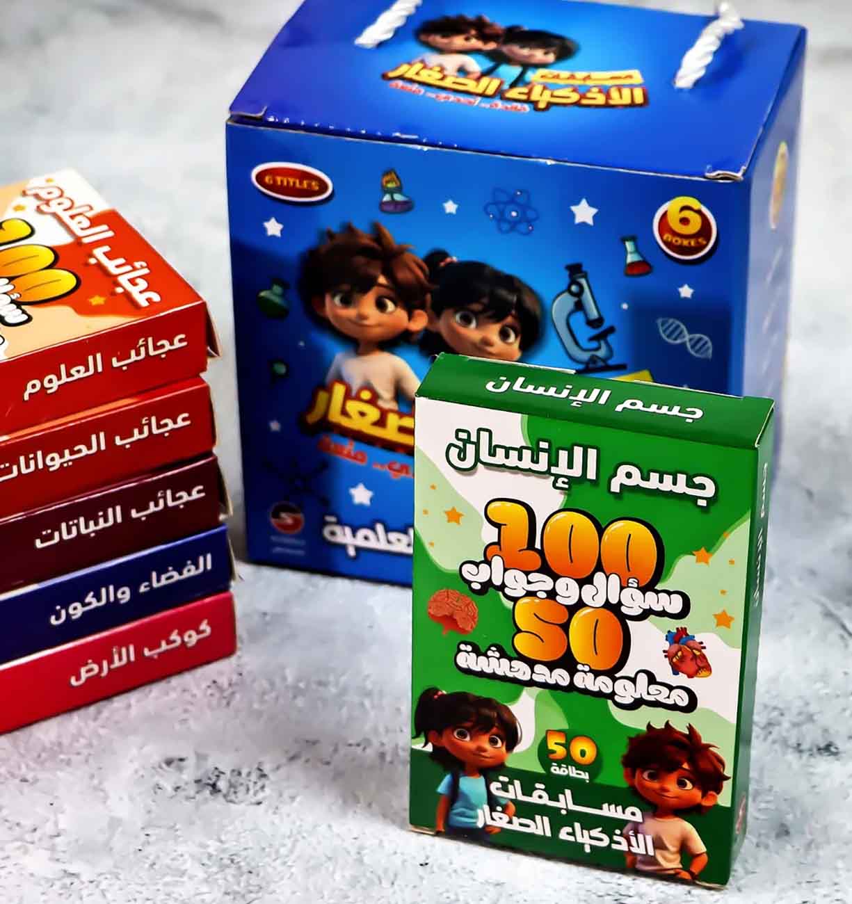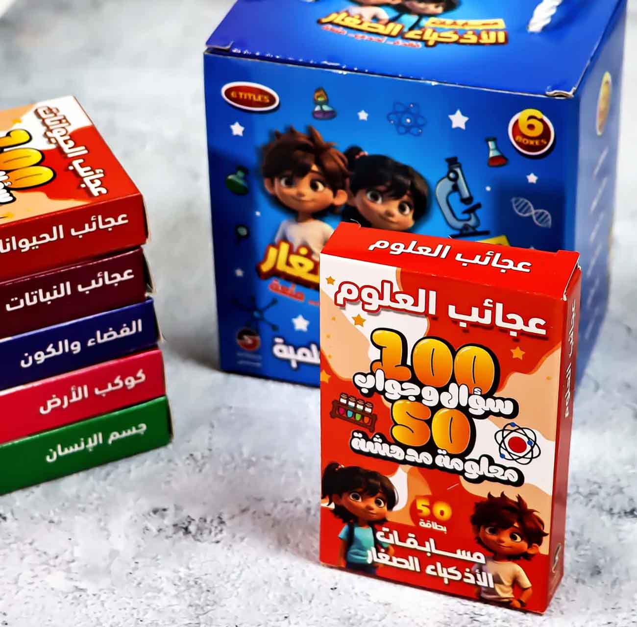 Each box contains 50 cards .. with a question and answer on one side and an image with simplified information on the other.