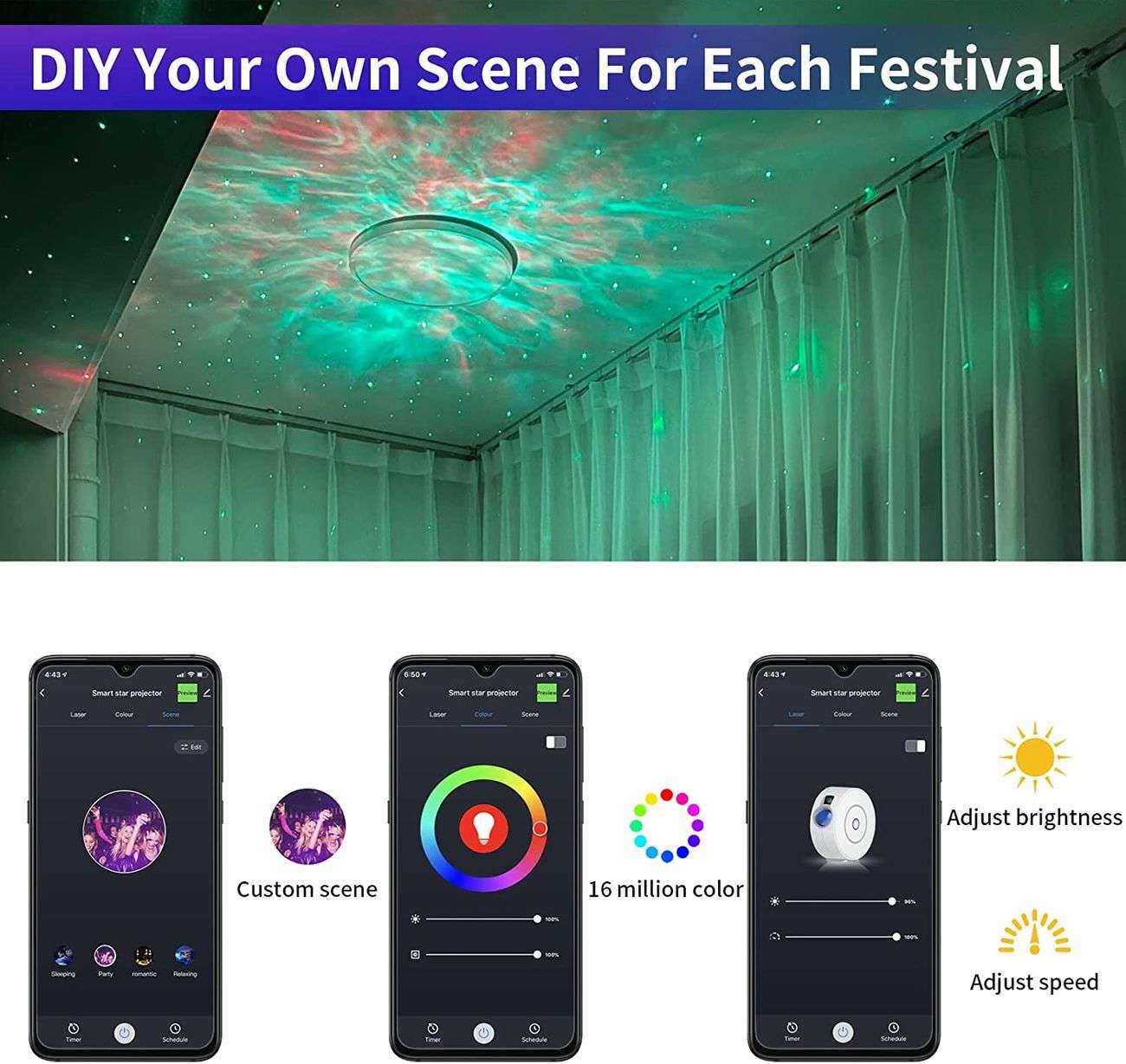 Ultra Quiet / The galaxy projector for bedroom works super quietly which will not disturb your kids from sleeping. Also the star projector galaxy light can build relaxed and pleasant atmosphere for your family anytime and anywhere.