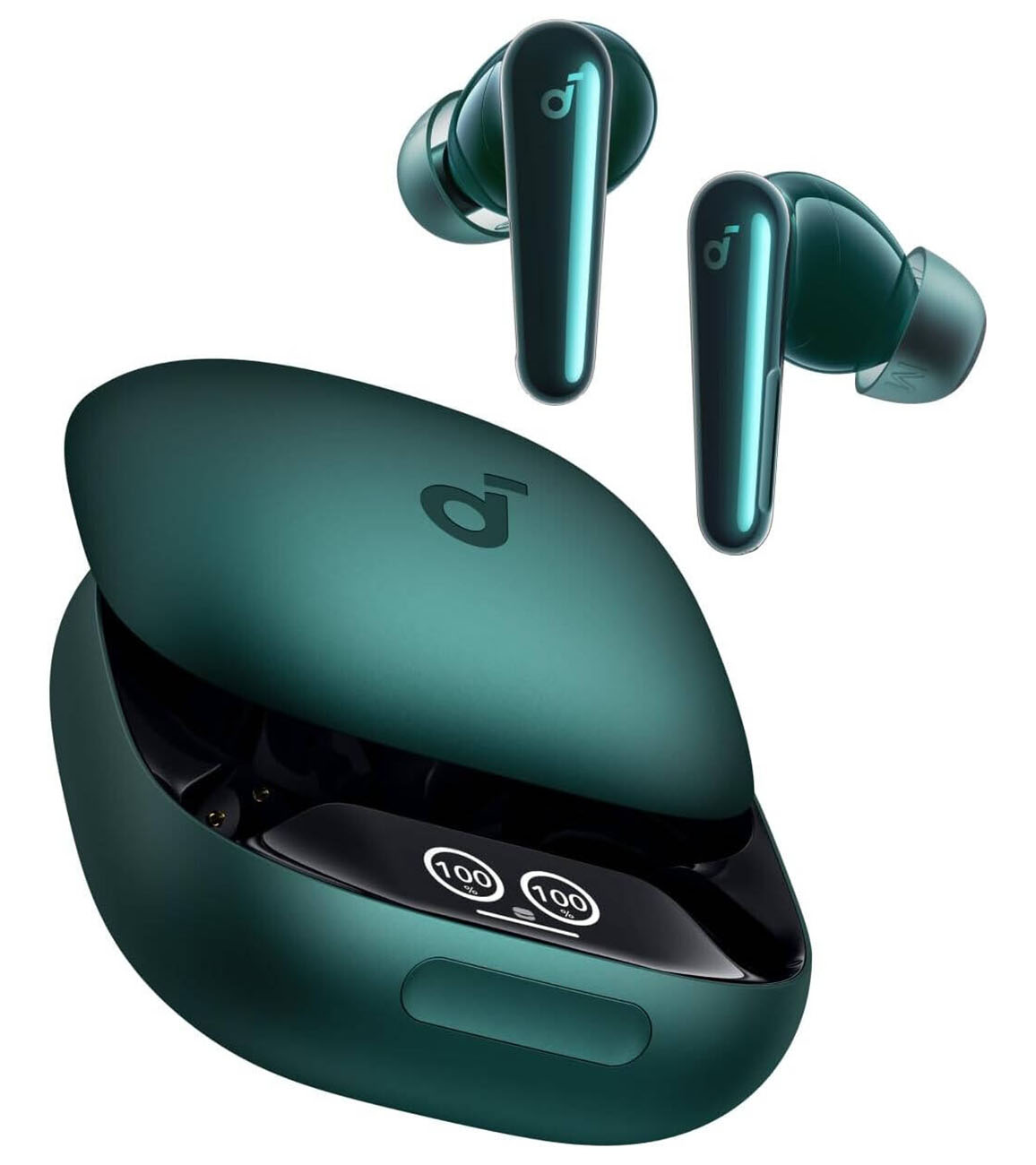 Charging case includes a small display for earbud settings control.