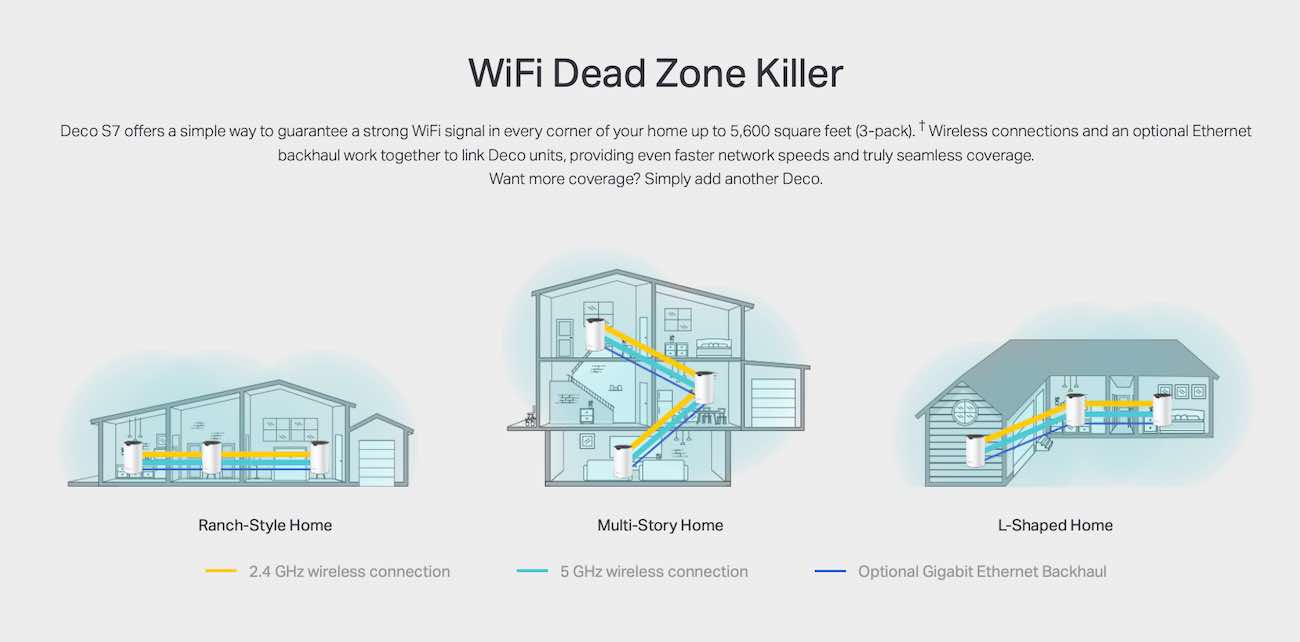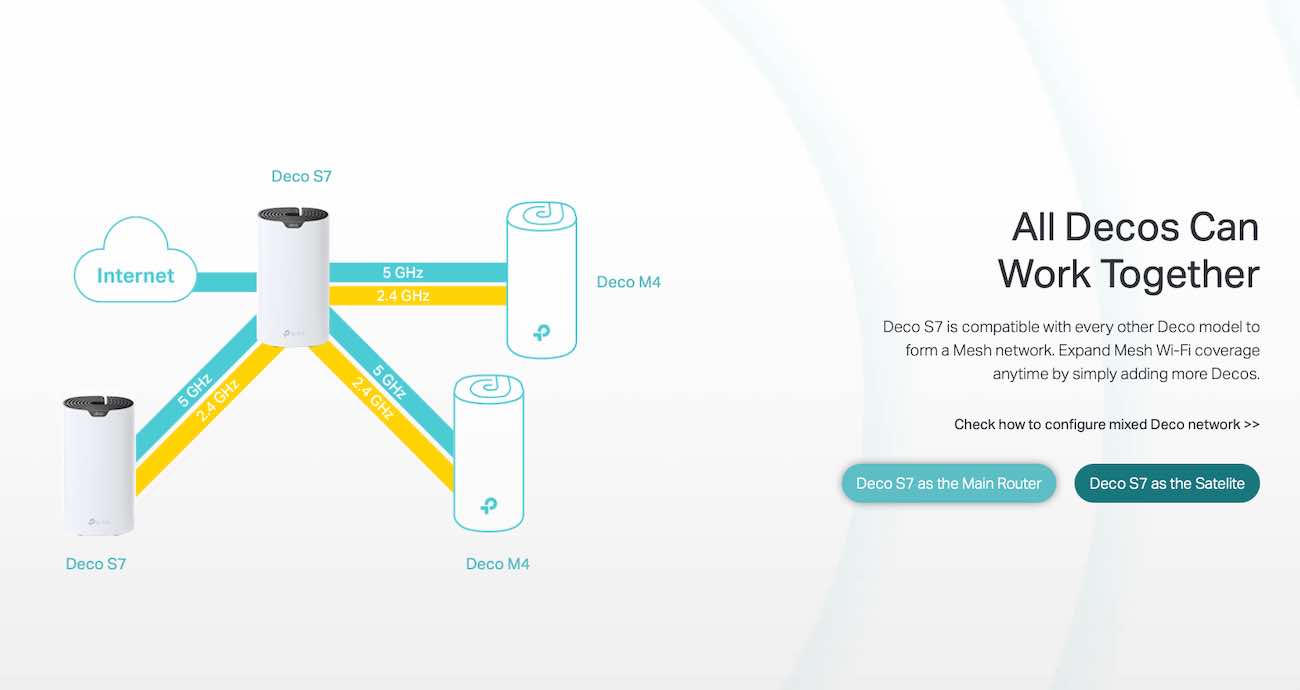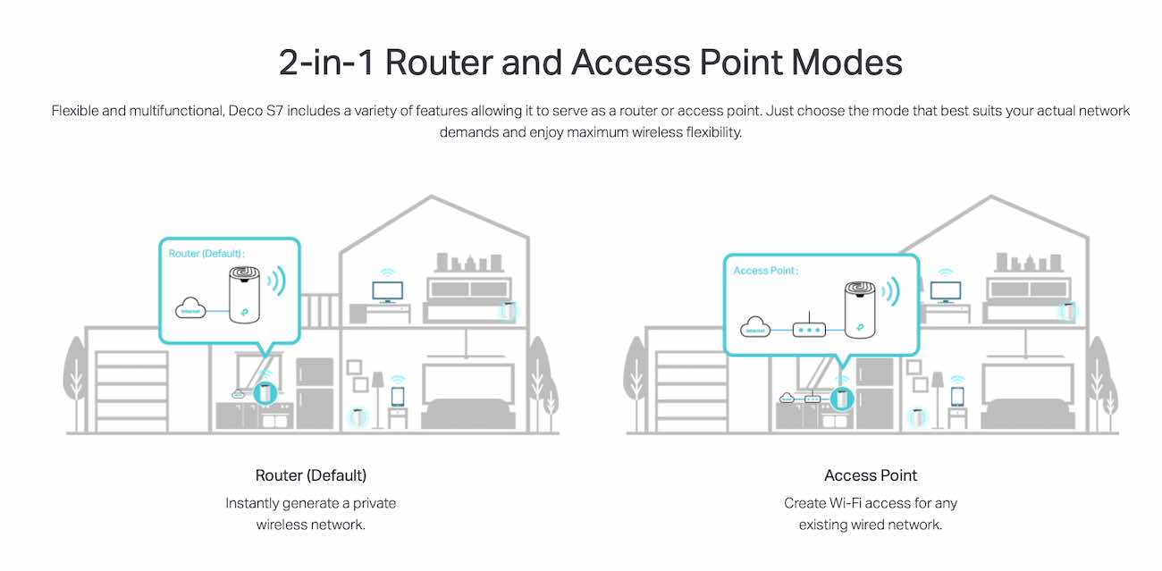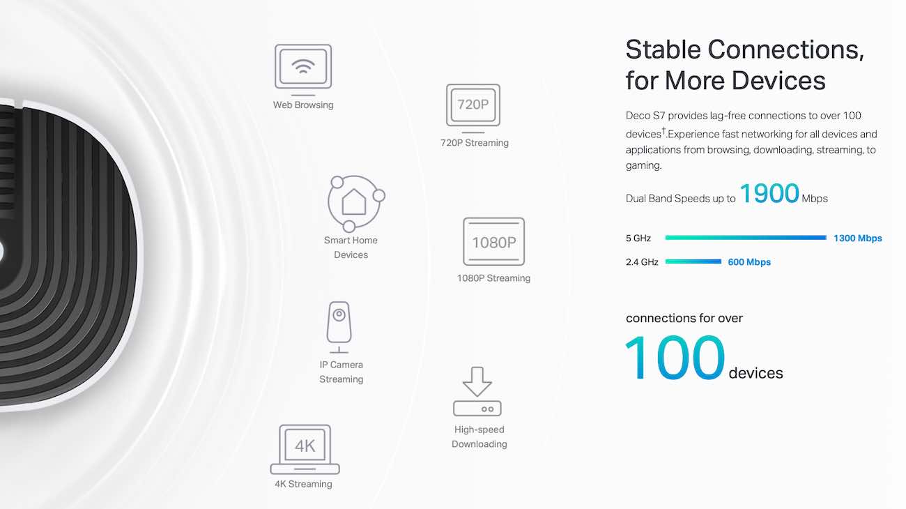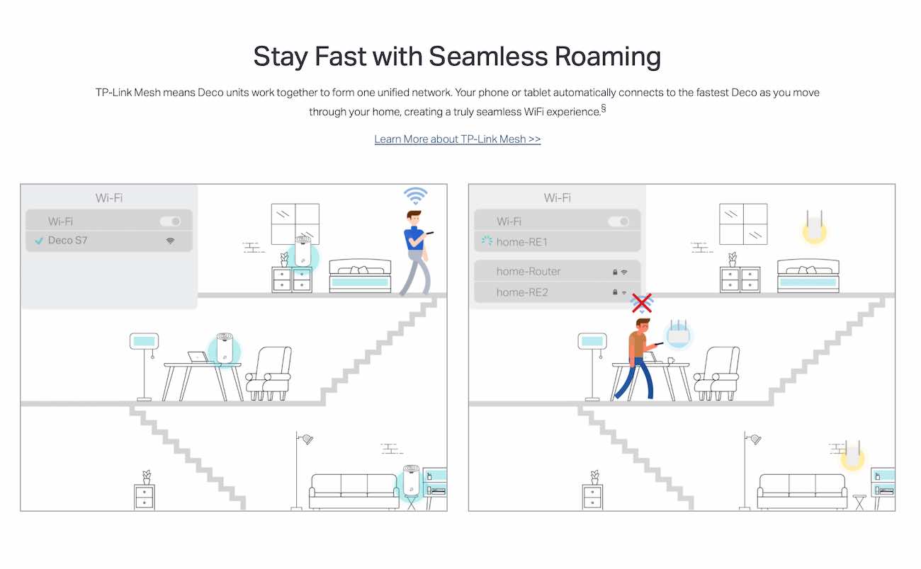 Features Deco Mesh technology, creating a unified network with seamless coverage and automatically switches between them according to your movement in the house.