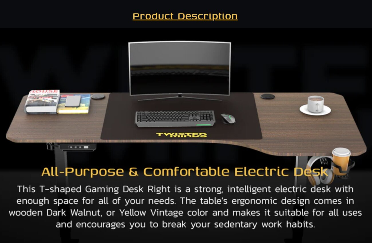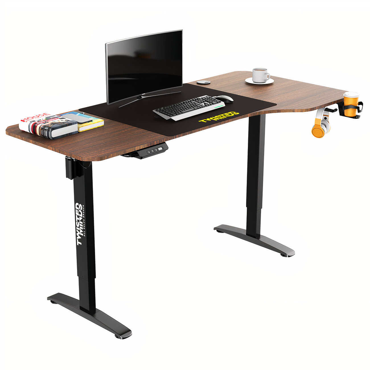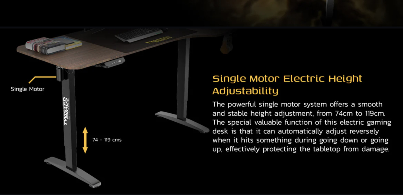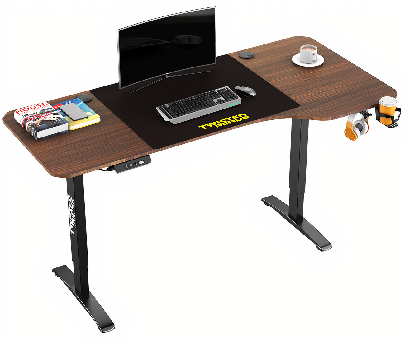 The Twisted Minds T Shaped Gaming Desk is a table that you can adjust electronically to different heights, with a maximum height of 119cm. It comes with a mouse pad and space for a cup and a headset.