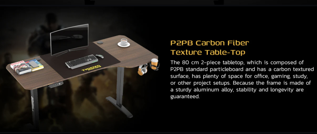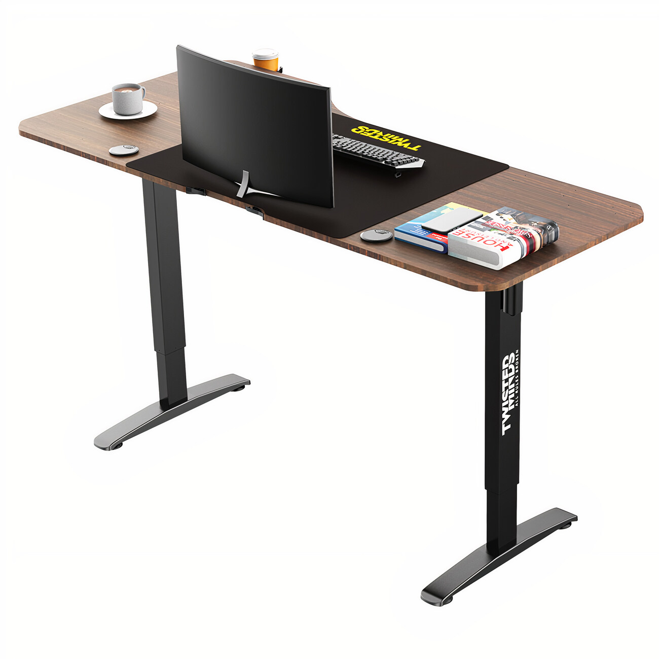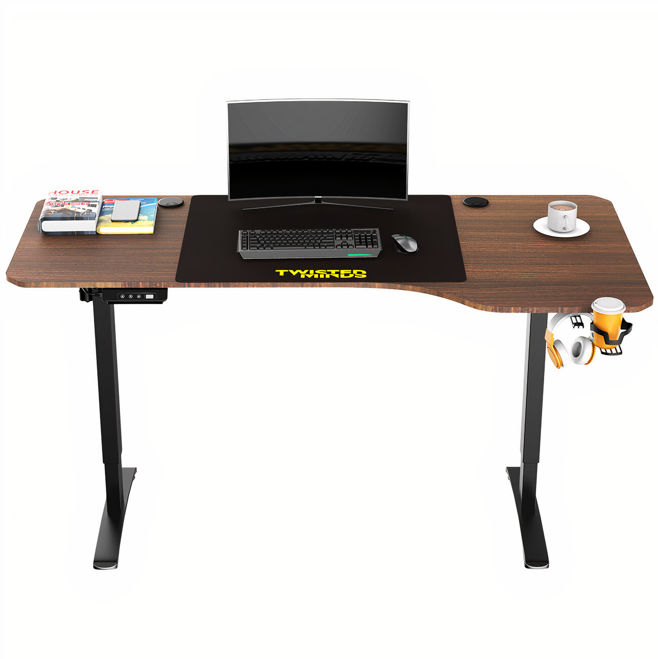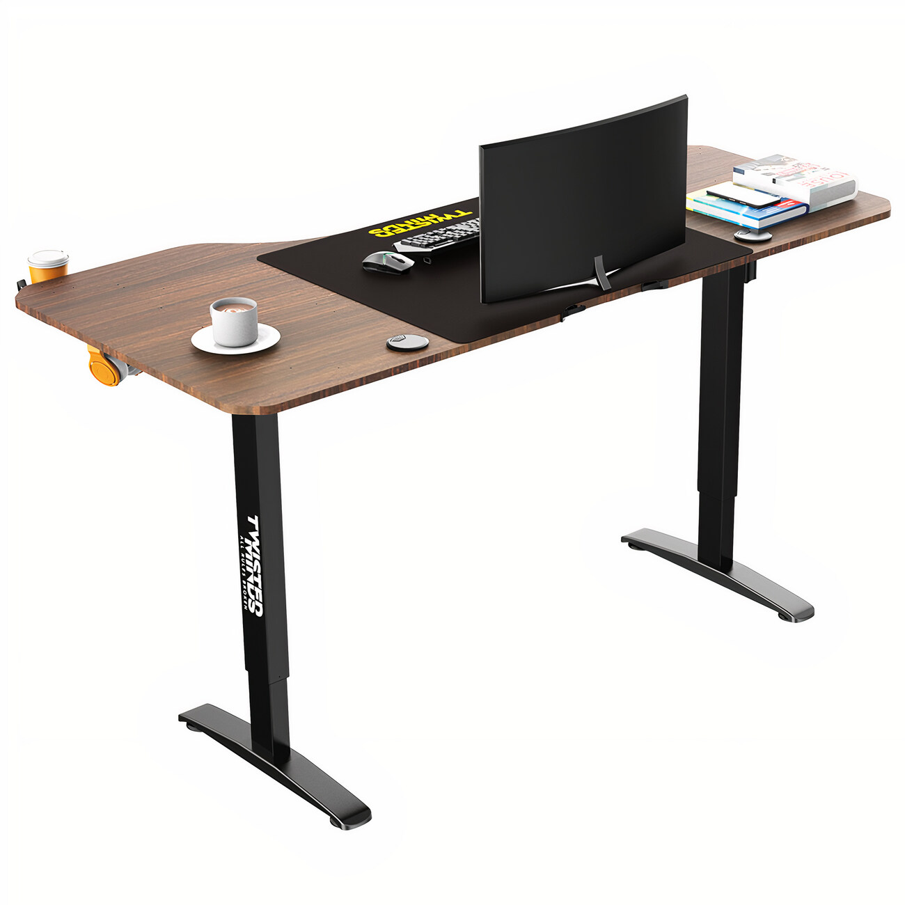 The Twisted Minds T Shaped Gaming Desk is a table that you can adjust electronically to different heights, with a maximum height of 119cm. It comes with a mouse pad and space for a cup and a headset.