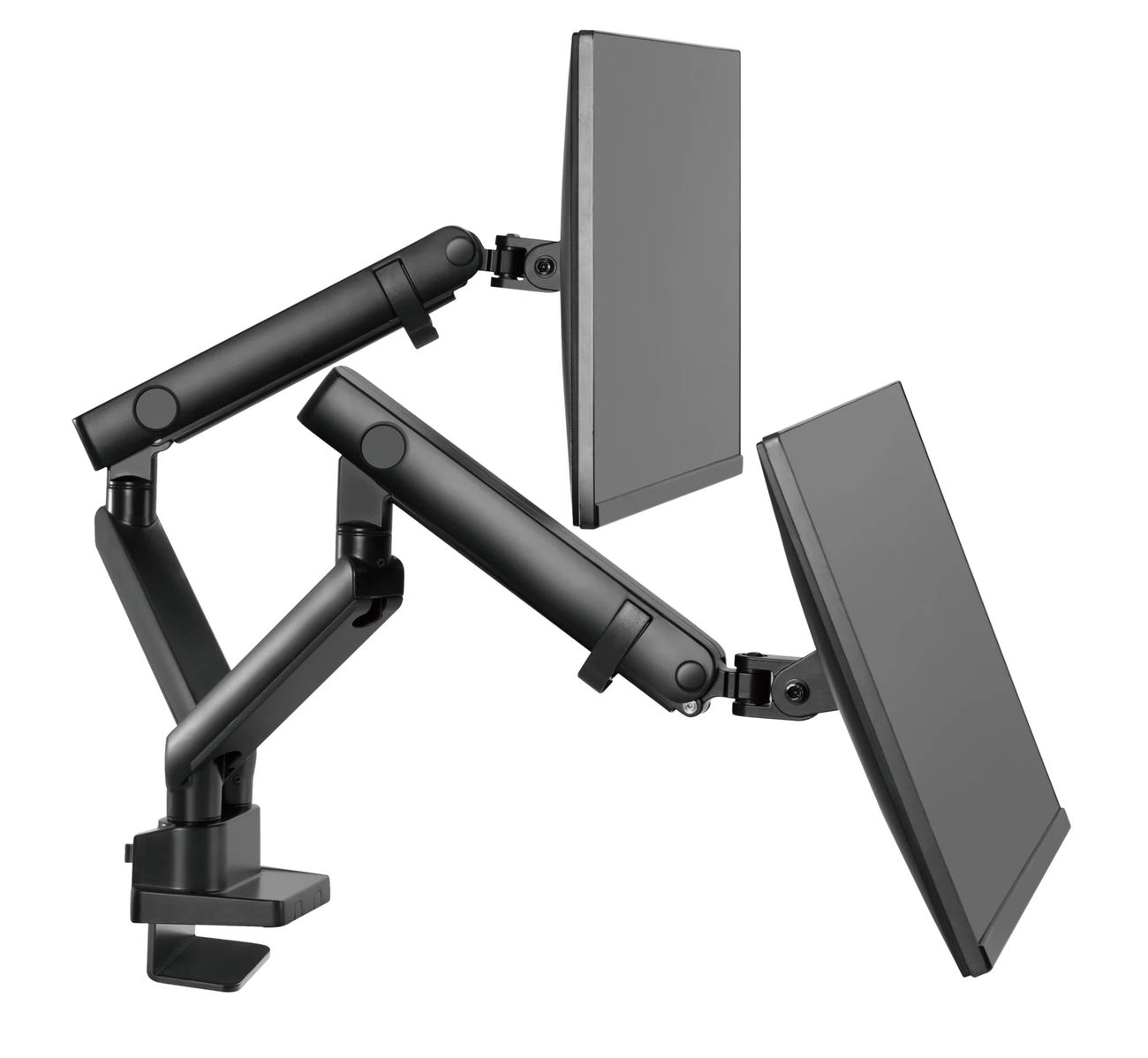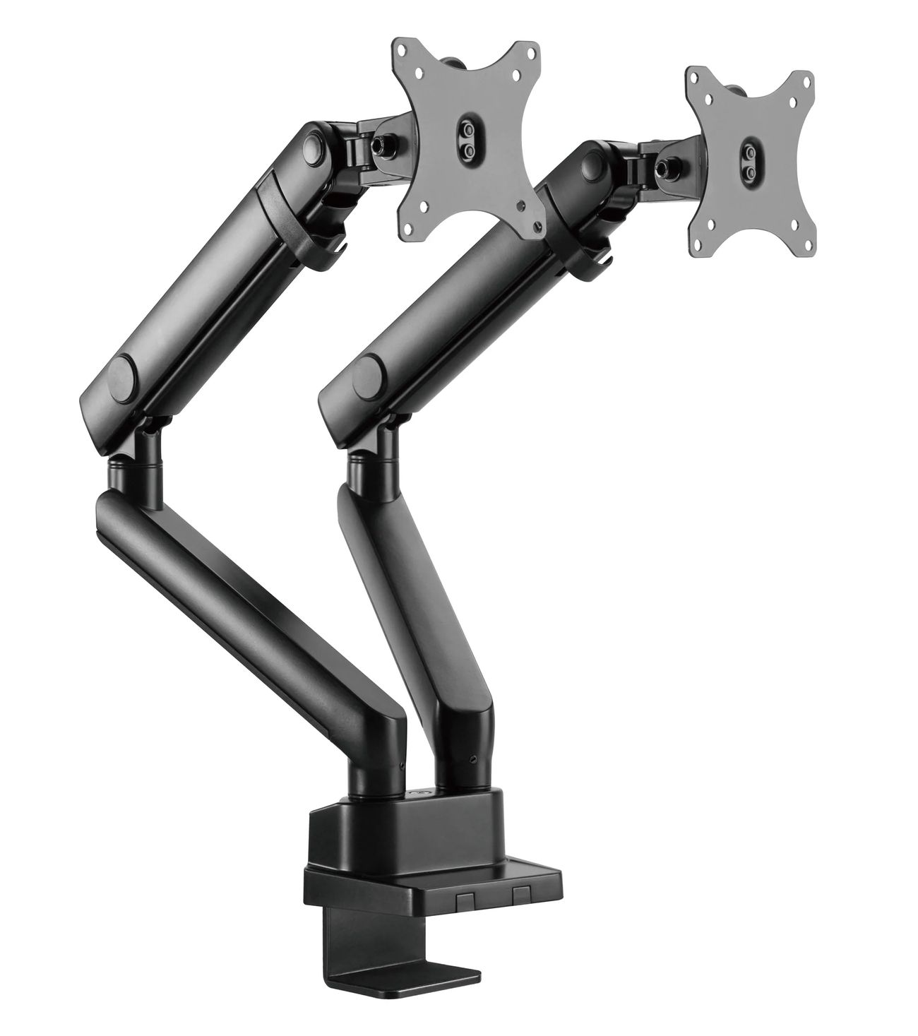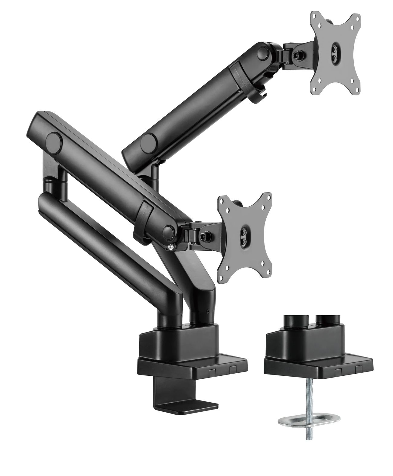 Surface Finish: Powder Coating Color: Matte Black Dimensions: 1066x129x697mm (42"x5.1"x27.4") Fit Screen Size: 17" 32" Fit Curved Monitor: Yes Screen Quantity: 2 Weight Capacity (per screen): 0~8kg (0lbs~17.6lbs) VESA Compatible: 100x100,75x75 Tilt Range: +90 9090° Swivel Range: +90 9090° Screen Rotation: +90 9090° Arm Full Extension: 514mm (20.2") Pole Height: 362mm (14.3") Installation: Grommet, Clamp Suggested Desktop Thickness: ClampClamp:10~50mm Grommet Grommet:10~50mm (Clamp Clamp:0.39"~2" Grommet Grommet:0.39"~2")