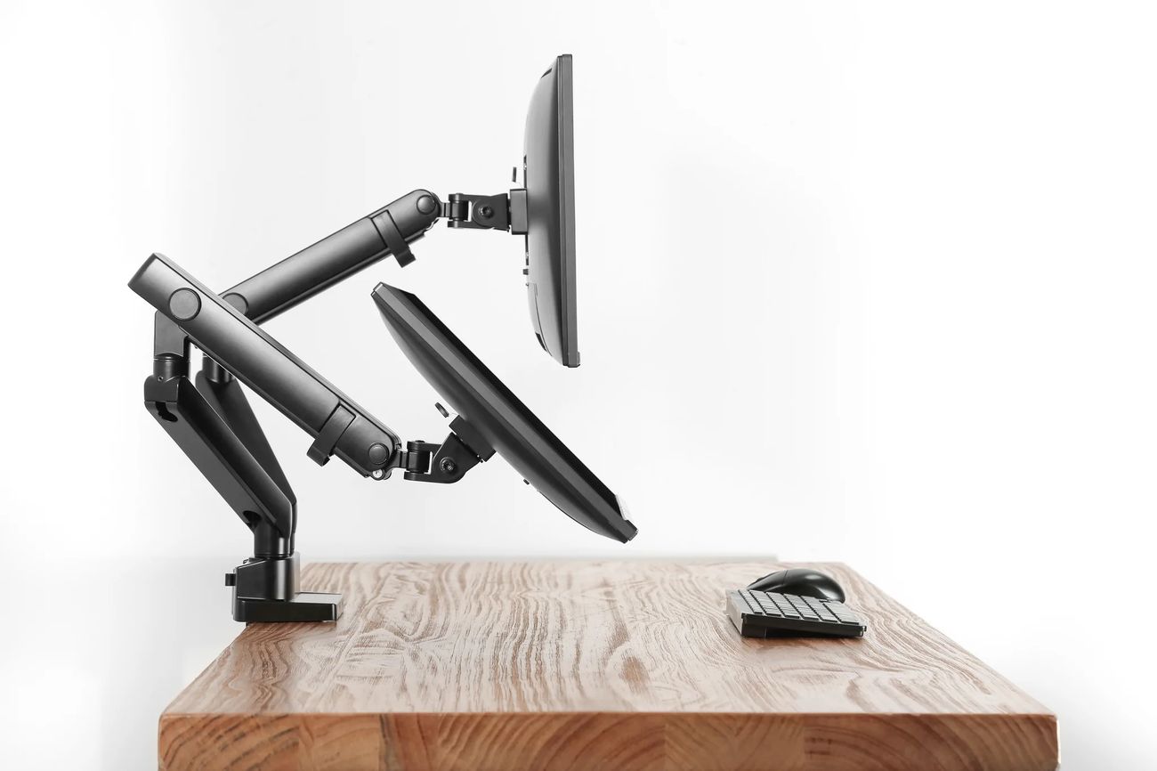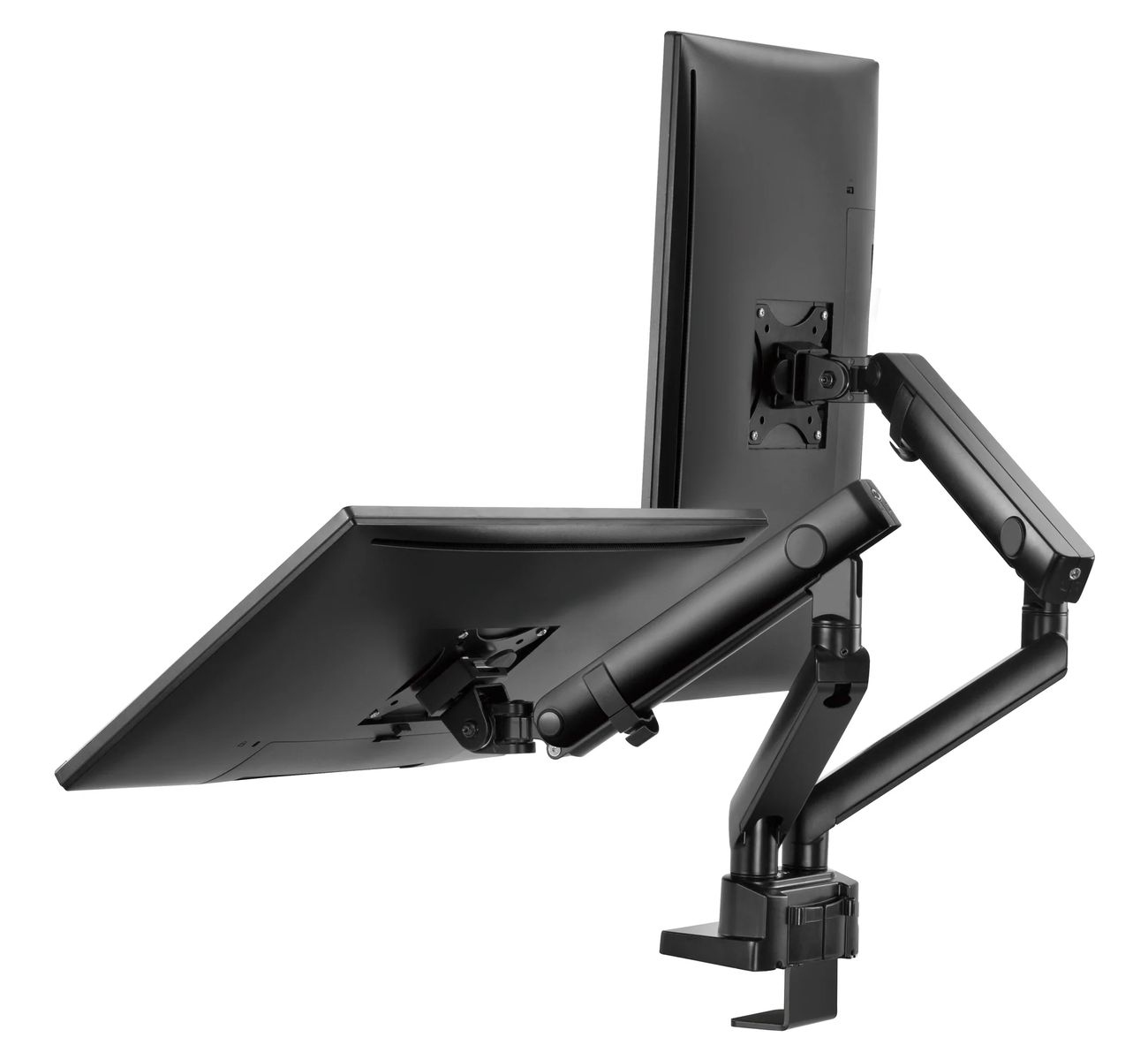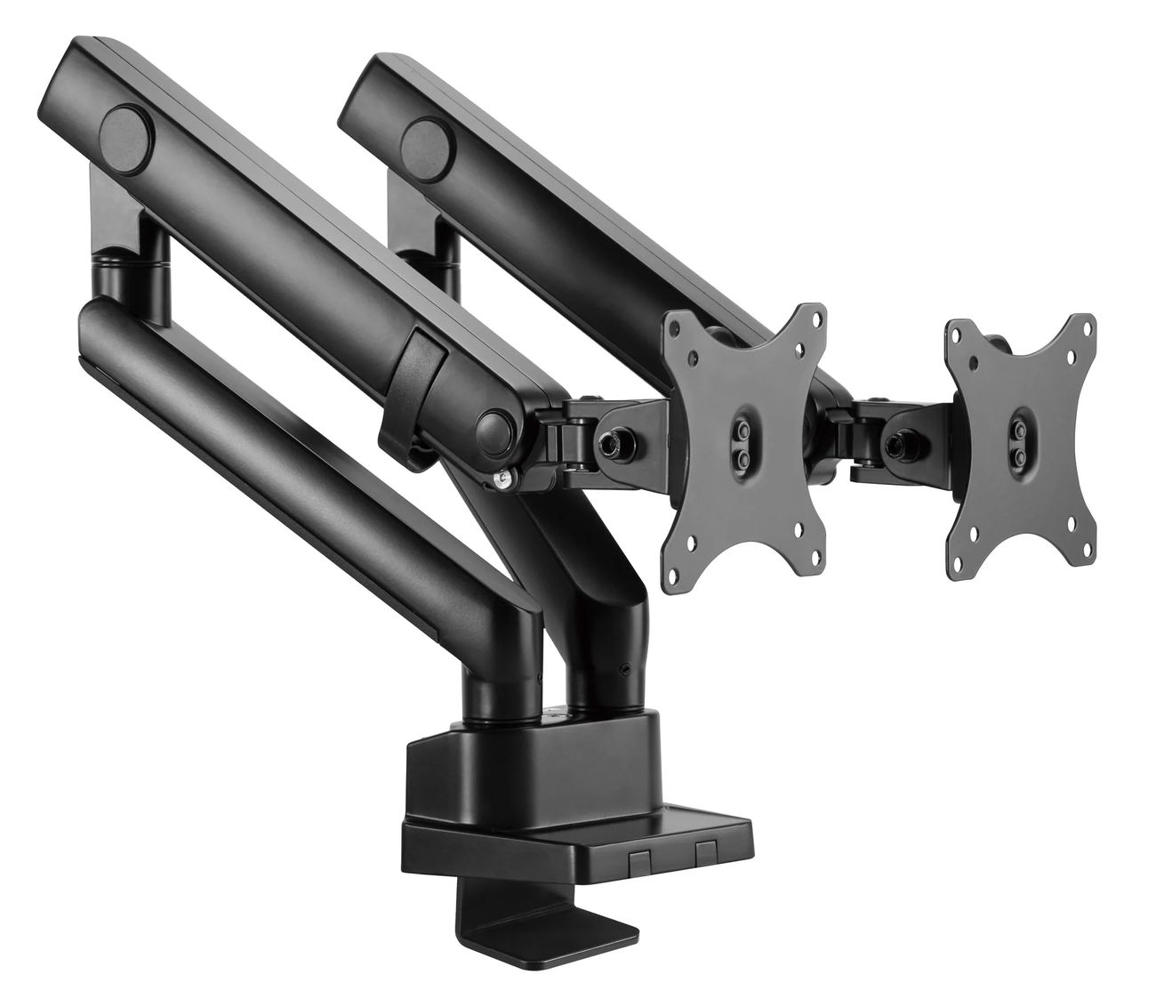 Surface Finish: Powder Coating Color: Matte Black Dimensions: 1066x129x697mm (42"x5.1"x27.4") Fit Screen Size: 17" 32" Fit Curved Monitor: Yes Screen Quantity: 2 Weight Capacity (per screen): 0~8kg (0lbs~17.6lbs) VESA Compatible: 100x100,75x75 Tilt Range: +90 9090° Swivel Range: +90 9090° Screen Rotation: +90 9090° Arm Full Extension: 514mm (20.2") Pole Height: 362mm (14.3") Installation: Grommet, Clamp Suggested Desktop Thickness: ClampClamp:10~50mm Grommet Grommet:10~50mm (Clamp Clamp:0.39"~2" Grommet Grommet:0.39"~2")