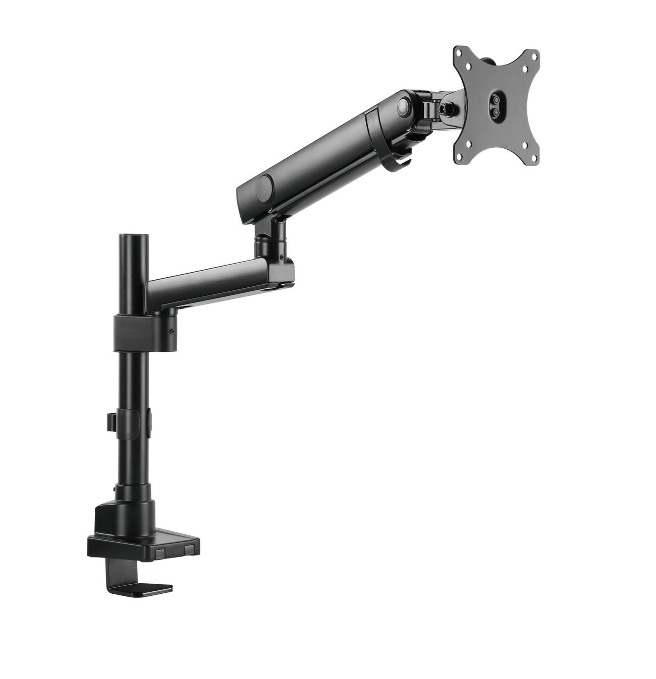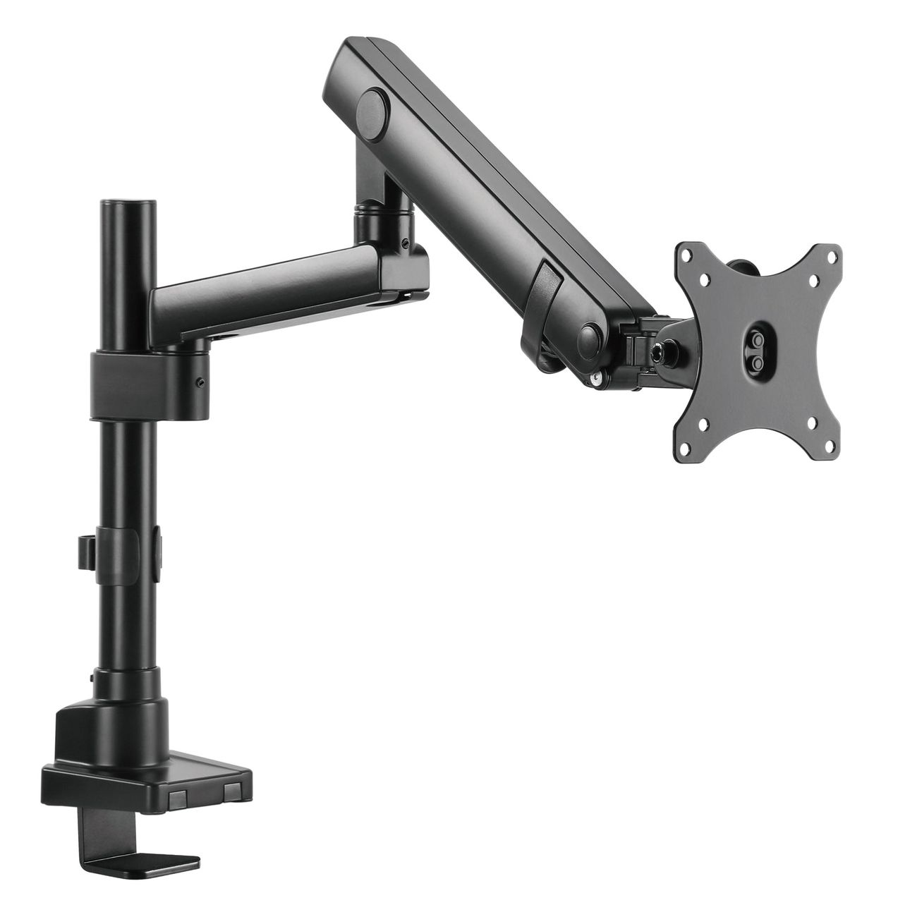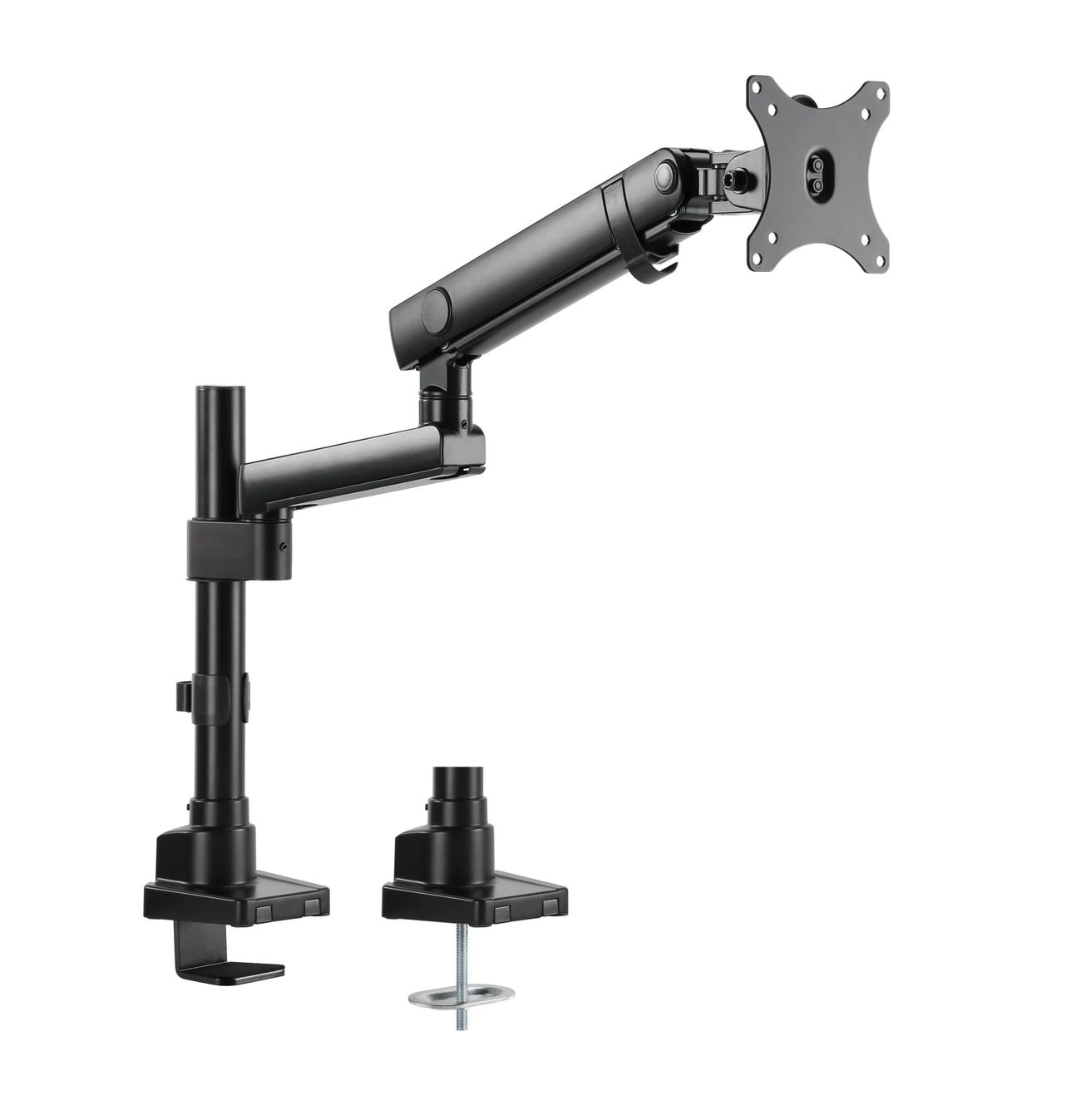 Surface Finish: Powder Coating Color: Matte Black Dimensions: 115x607x703mm (4.5"x23.9"x27.7") Fit Screen Size: 17" 32" Fit Curved Monitor: Yes Screen Quantity: 1 Weight Capacity (per screen): 0~8kg (0lbs~17.6lbs) VESA Compatible: 100x100,75x75 Tilt Range: Range:+90 9090° Swivel Range:+90 9090° Screen Rotation: +90 9090° Arm Full Extension:514mm (20.2") Pole Height: 362mm (14.3") Installation: Grommet, Clamp Suggested Desktop Thickness: ClampClamp10~50mm Grommet Grommet:10~50mm (Clamp Clamp:0.39"~2" Grommet Grommet:0.39"~2")