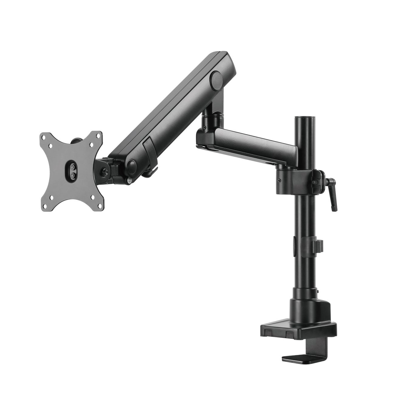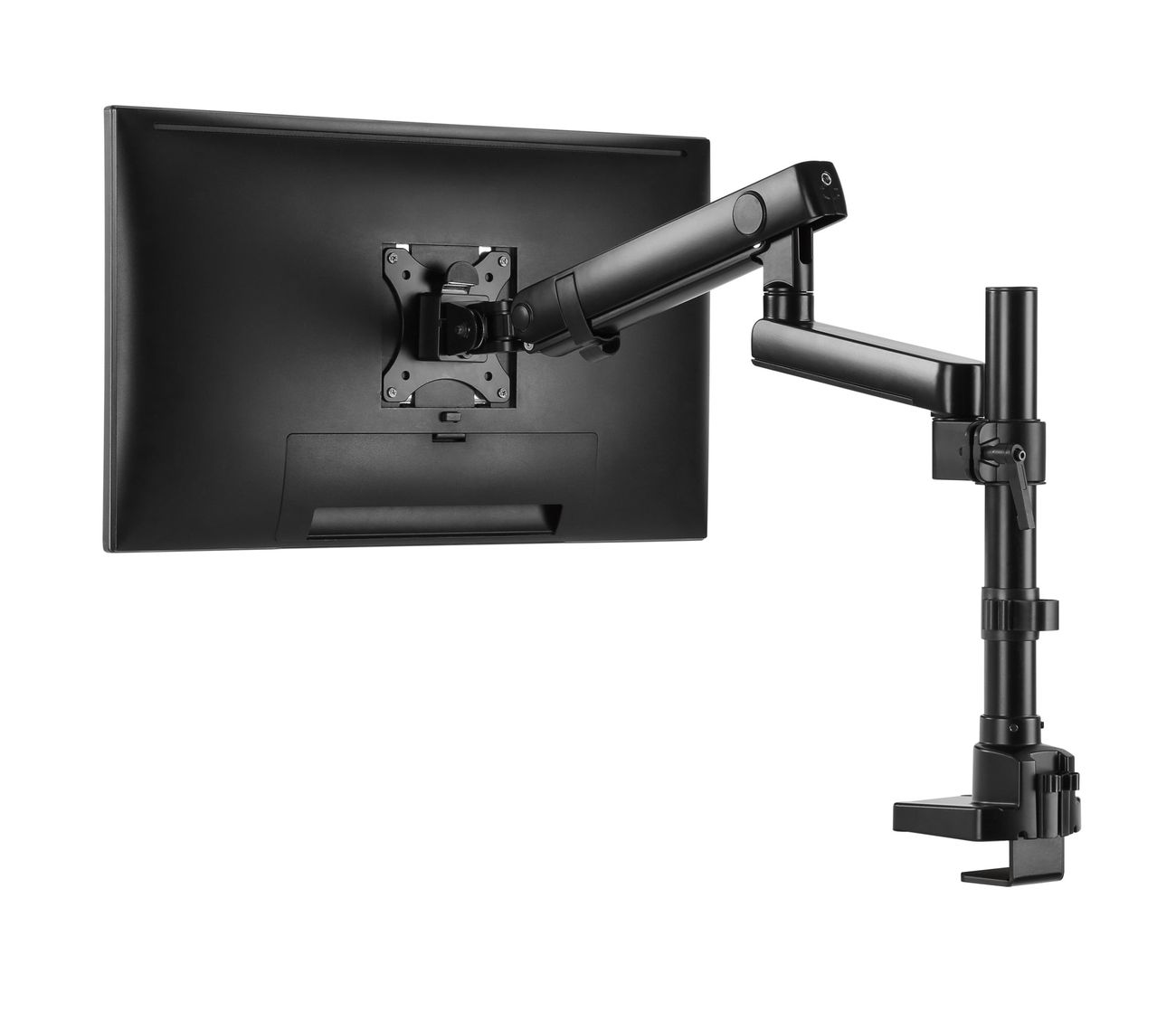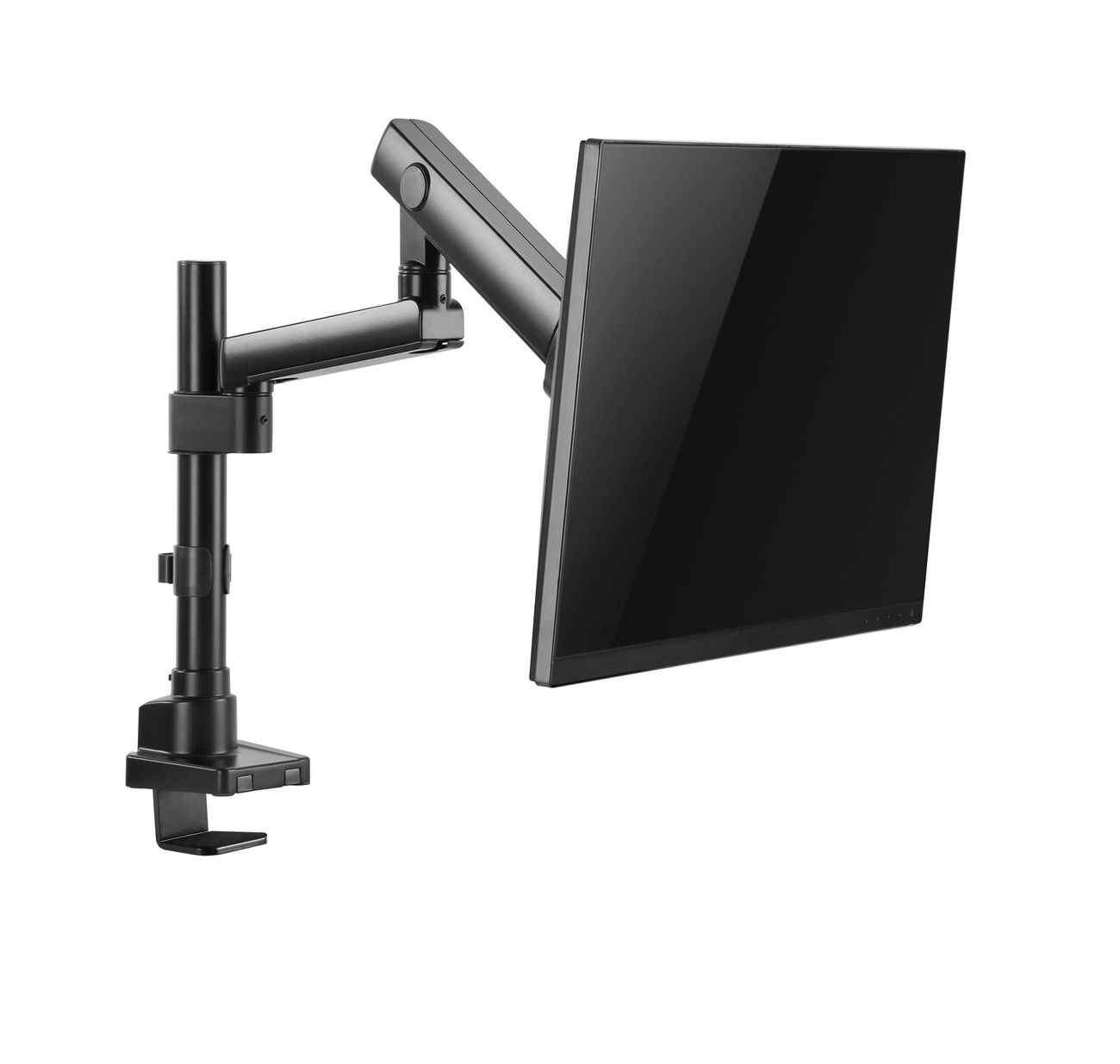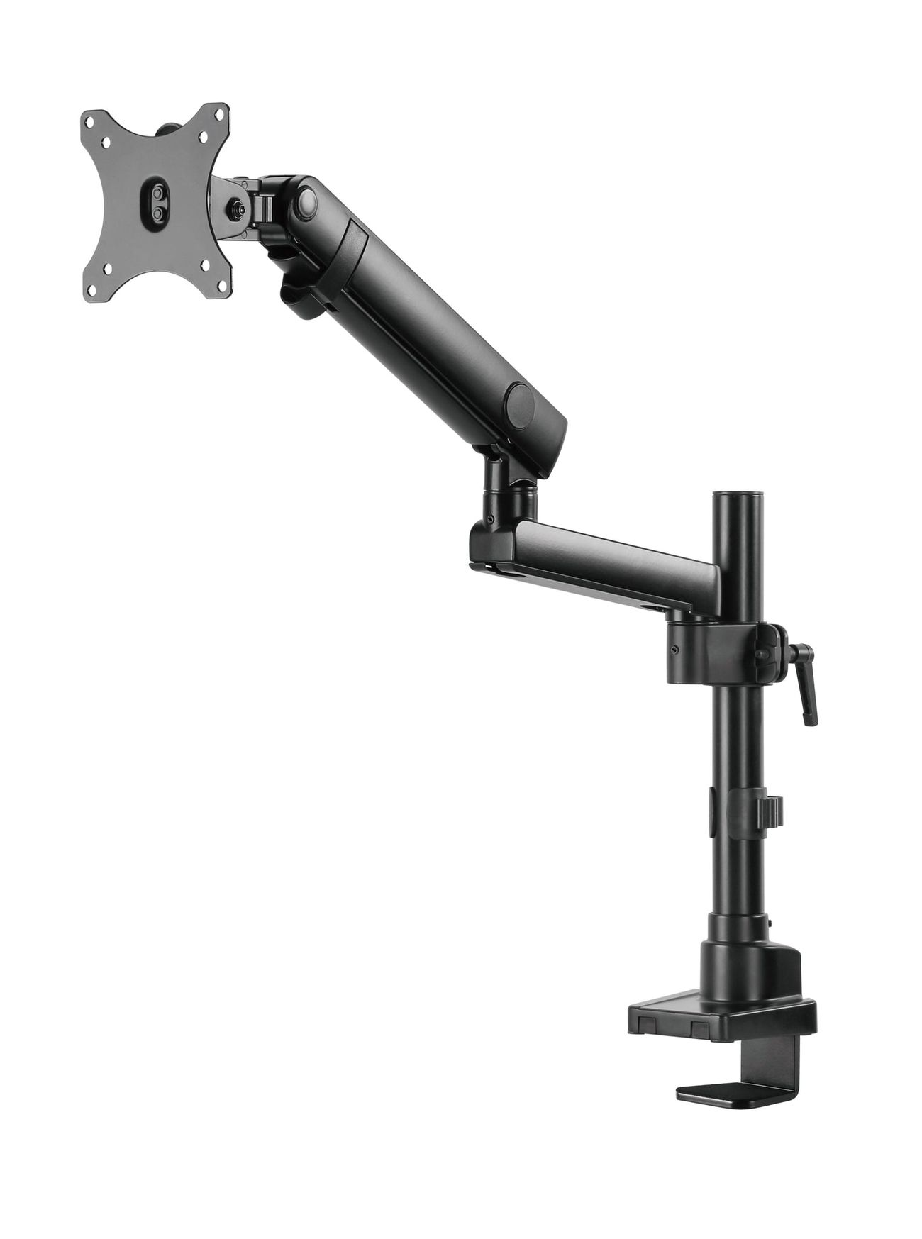 Surface Finish: Powder Coating Color: Matte Black Dimensions: 115x607x703mm (4.5"x23.9"x27.7") Fit Screen Size: 17" 32" Fit Curved Monitor: Yes Screen Quantity: 1 Weight Capacity (per screen): 0~8kg (0lbs~17.6lbs) VESA Compatible: 100x100,75x75 Tilt Range: Range:+90 9090° Swivel Range:+90 9090° Screen Rotation: +90 9090° Arm Full Extension:514mm (20.2") Pole Height: 362mm (14.3") Installation: Grommet, Clamp Suggested Desktop Thickness: ClampClamp10~50mm Grommet Grommet:10~50mm (Clamp Clamp:0.39"~2" Grommet Grommet:0.39"~2")