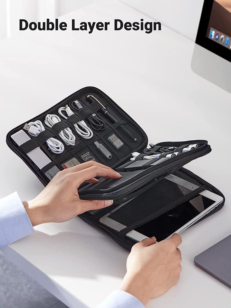 Double-layer Design: The upper layer is used to organize small items such as USB cables, SD cards and chargers. The lower layer can hold larger gadgets such as bulky wires, power supplies, adapters, external hard drives, small e-reader, etc.