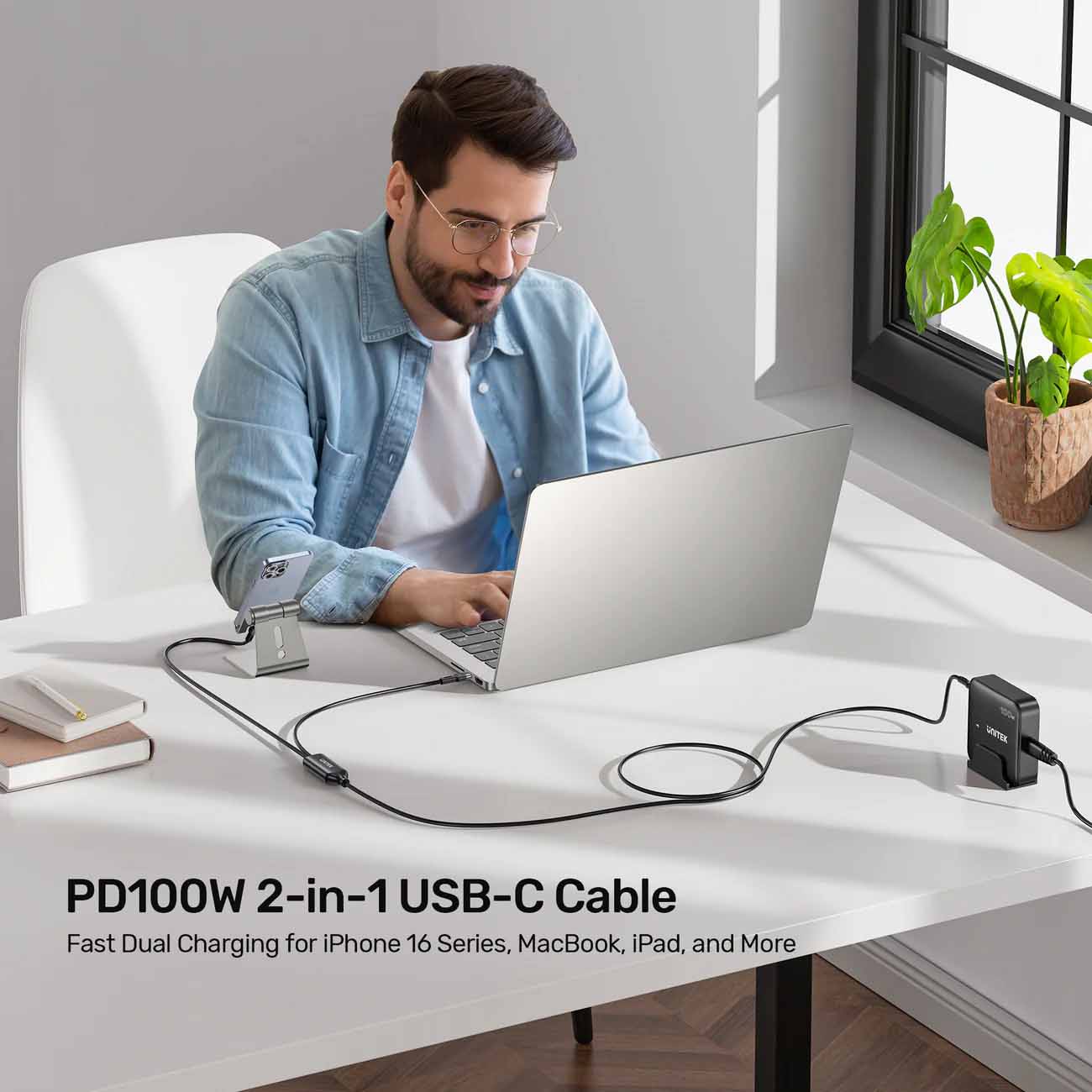 Unitek Type-C to Type-C Cable / Second Input With 90-Degree Angle / 100W Power / 2 Meters