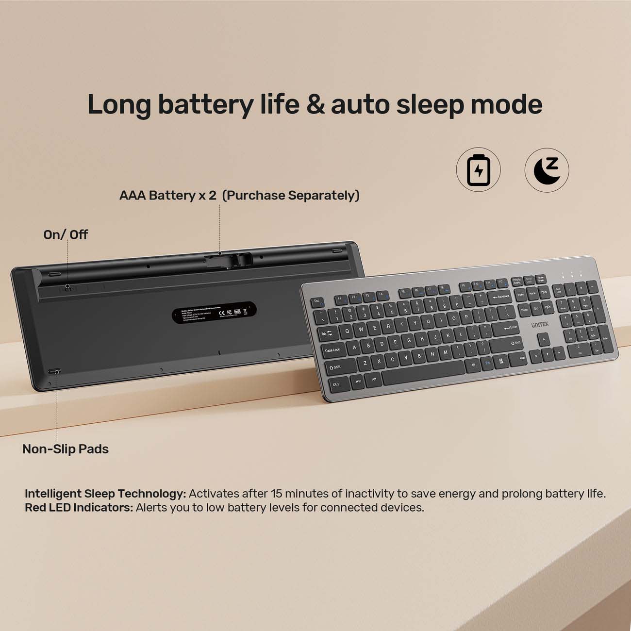 Keyboard and mouse enter sleep mode after 15 minutes of inactivity.