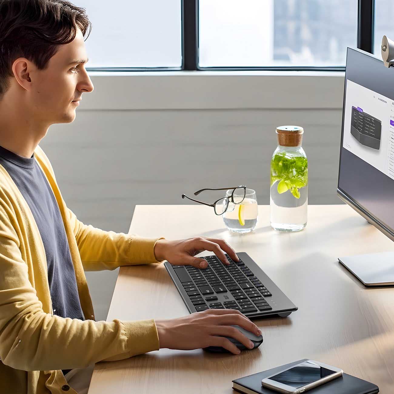 Ergonomic keyboard with a tilted design that maintains a natural wrist position and reduces strain during extended use.