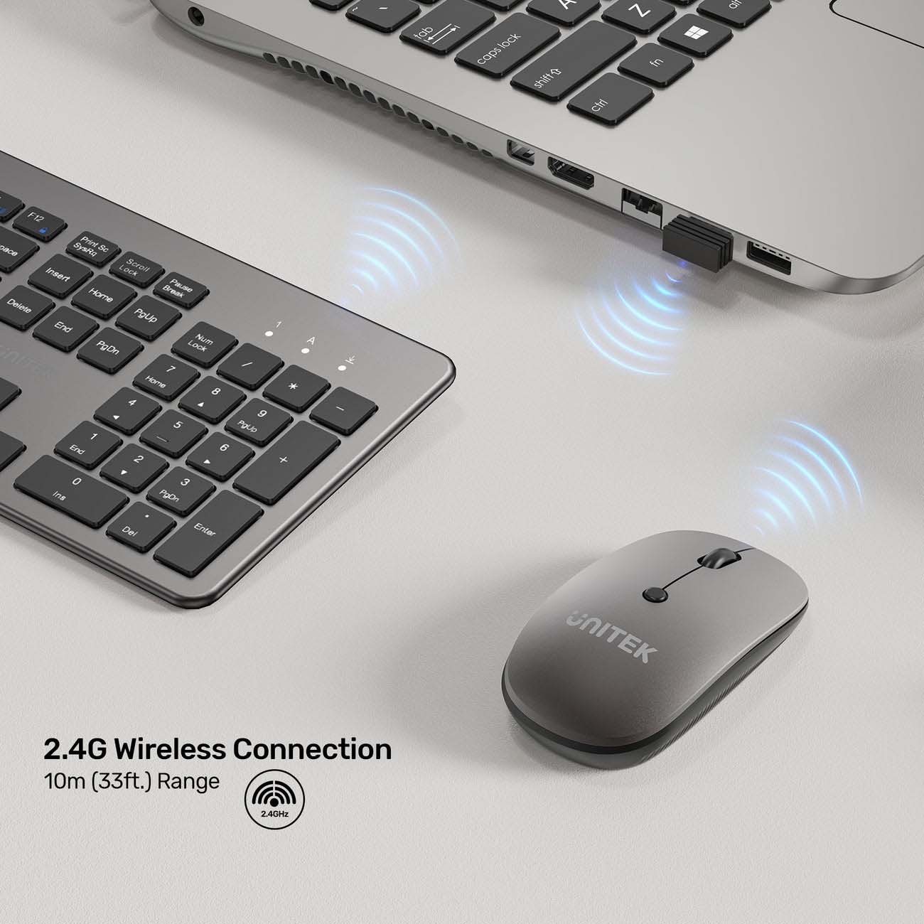 2.4GHz wireless connection with a working range of up to 10 meters.
