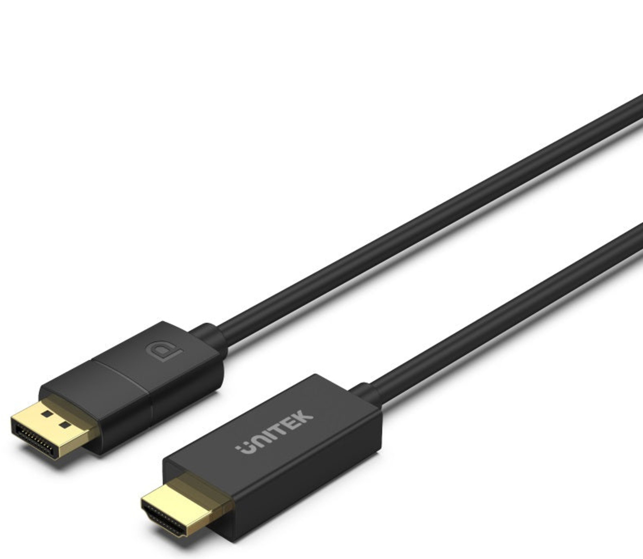 This cable connects a computer, laptop, or any other device with a DisplayPort output to a TV or monitor with an HDMI input.