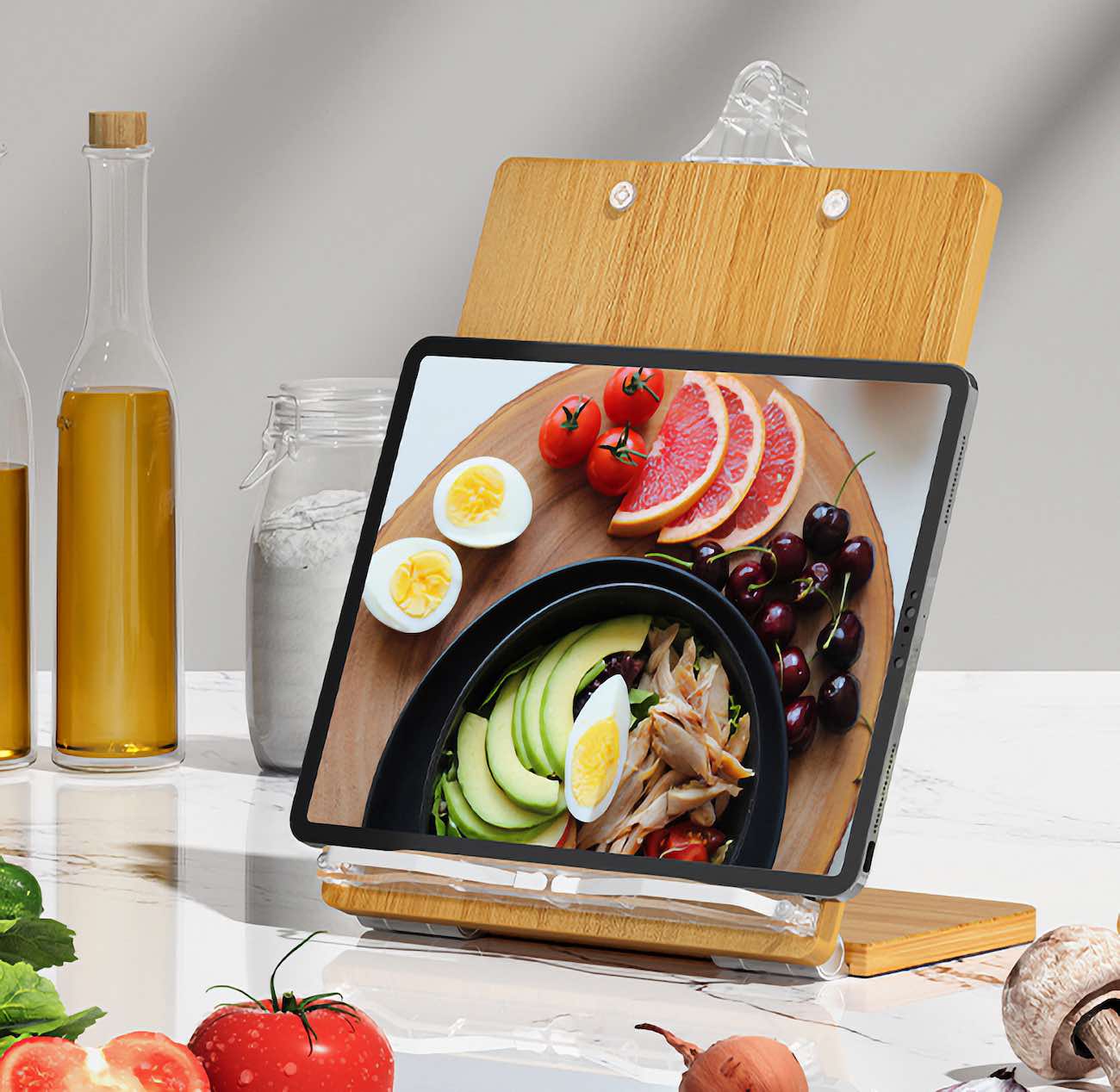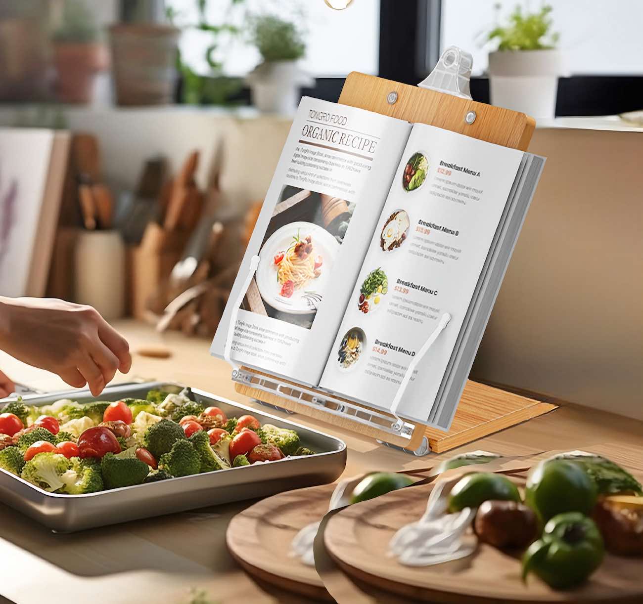 Excellent for holding cookbooks .. tablets .. or any paper you need while cooking.