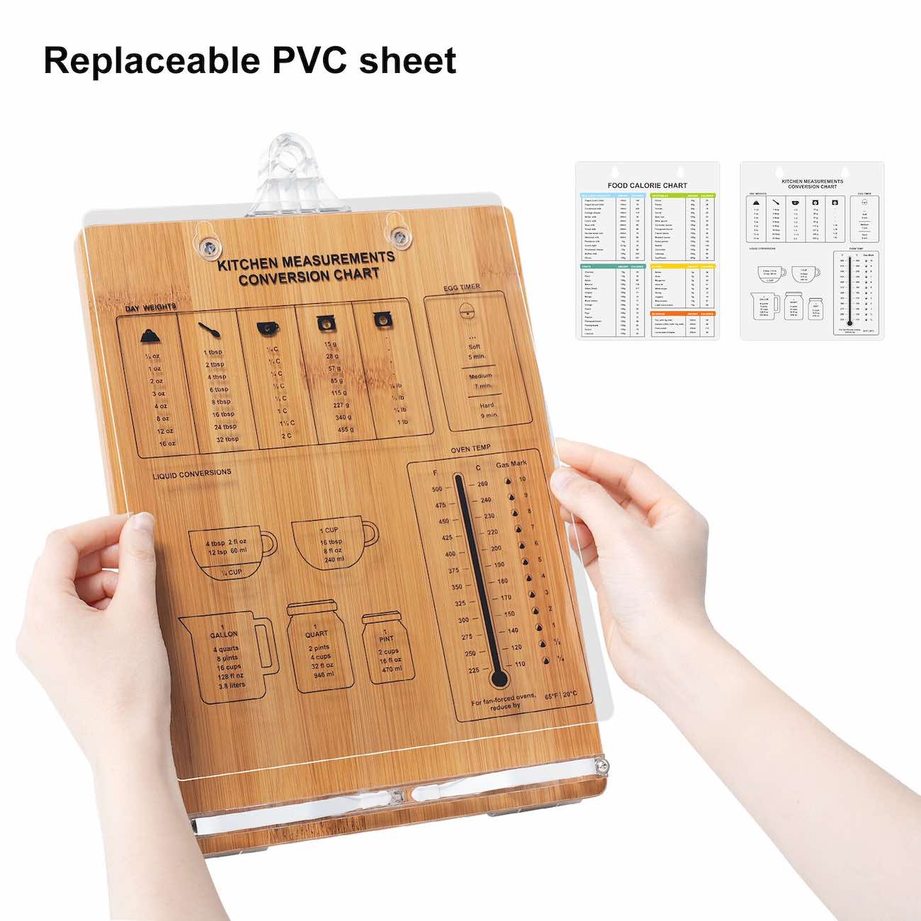 The stand includes a built-in conversion chart to help with essential weights and measurements needed in the kitchen.