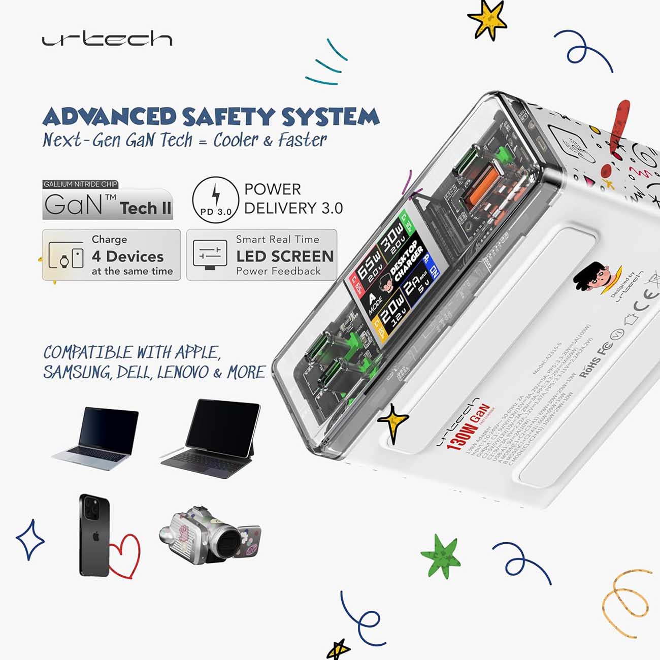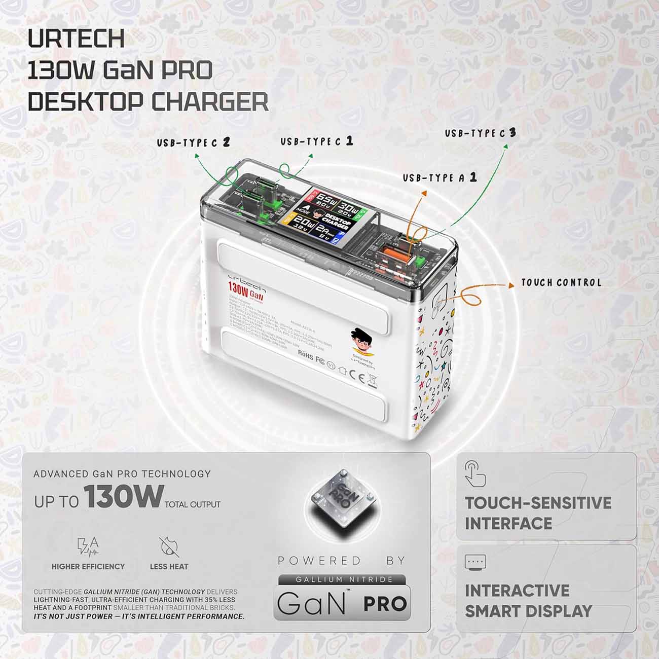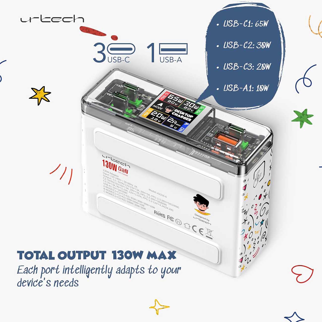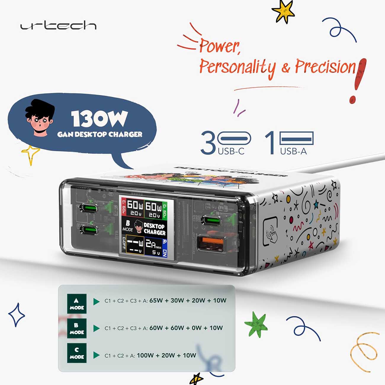 urtech ChargieBuddy Smart Charger / 3 Type-C + 1 USB-A Ports / 130W Power / Interactive Character