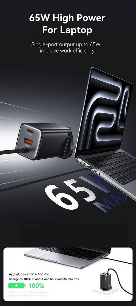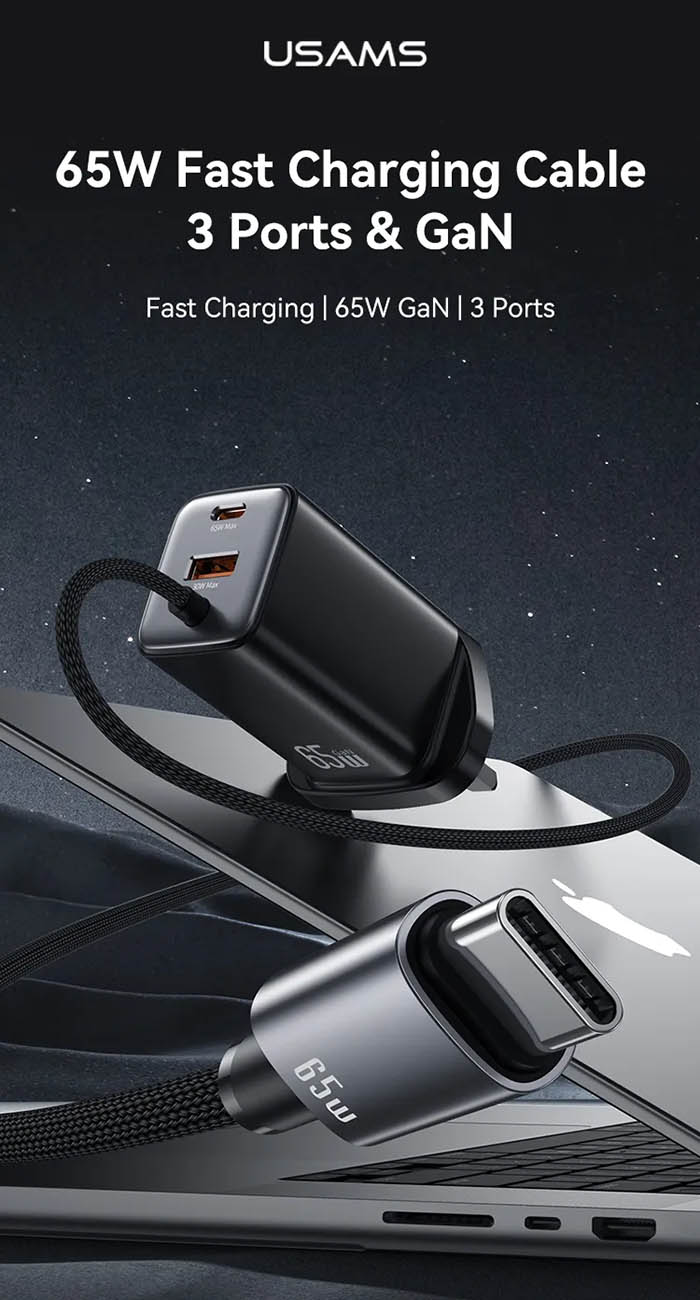 USAMS GaN Charger / Type-C Port + USB-A Port / Built-in Type-C Cable / 65W Power / White