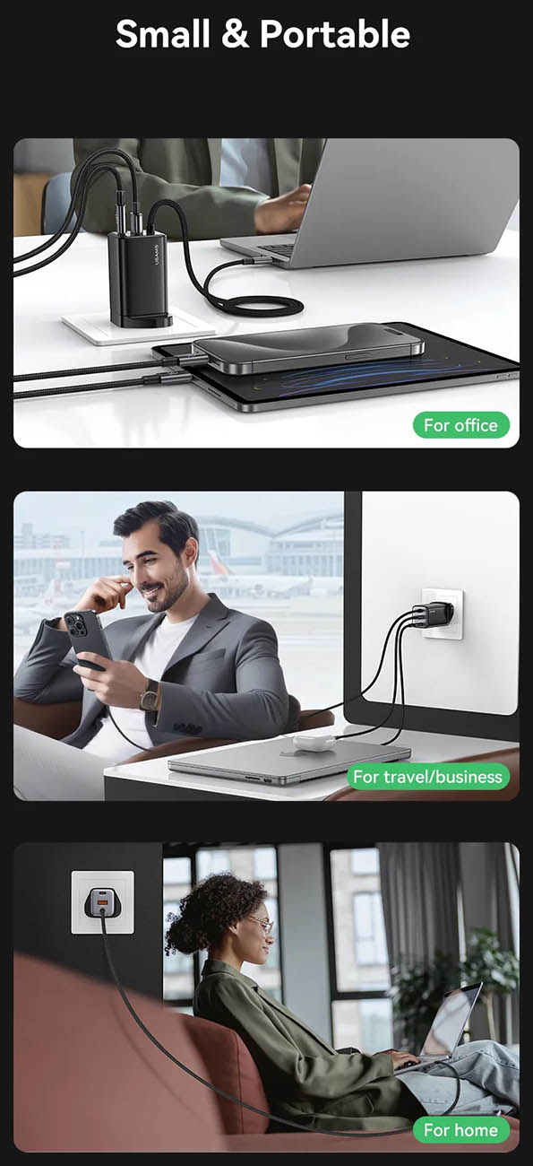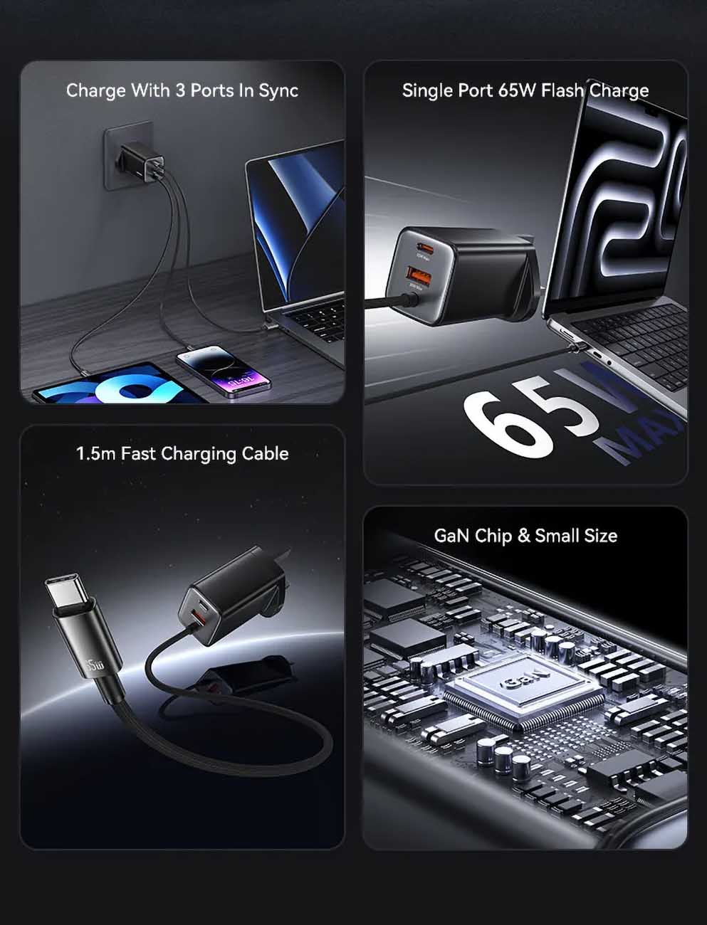 GaN Charger / 2 USB-C + 1 USB Ports / 65W / Black
