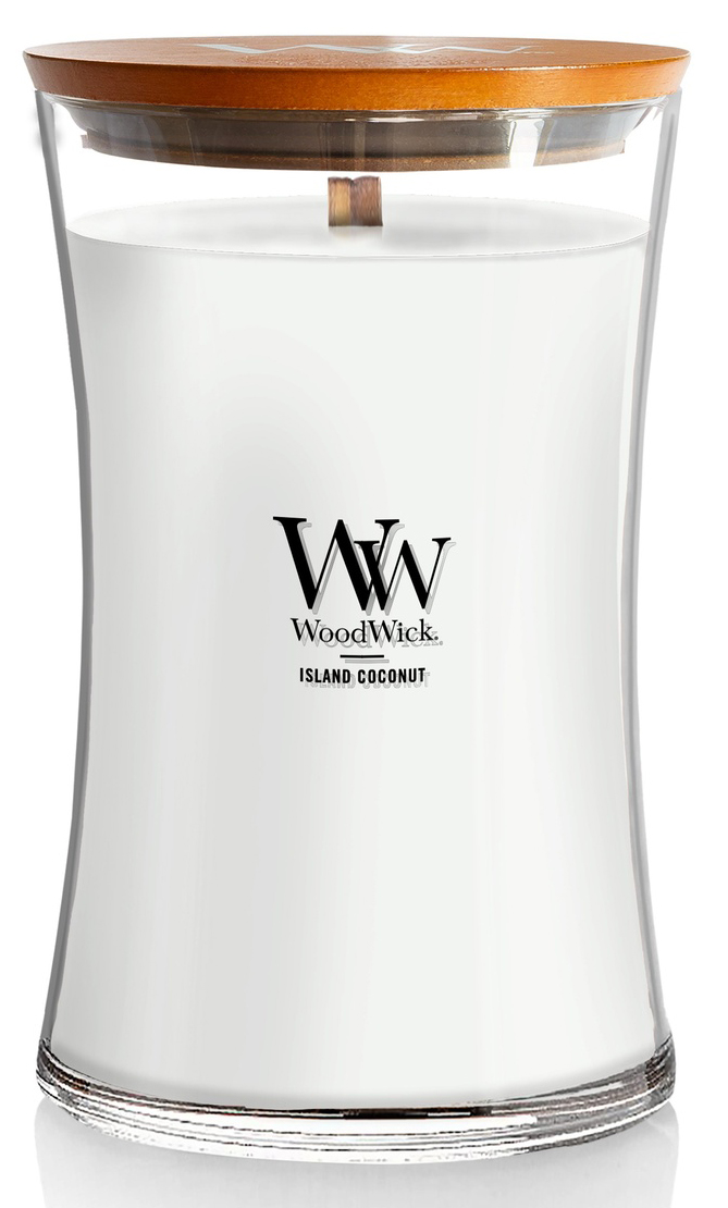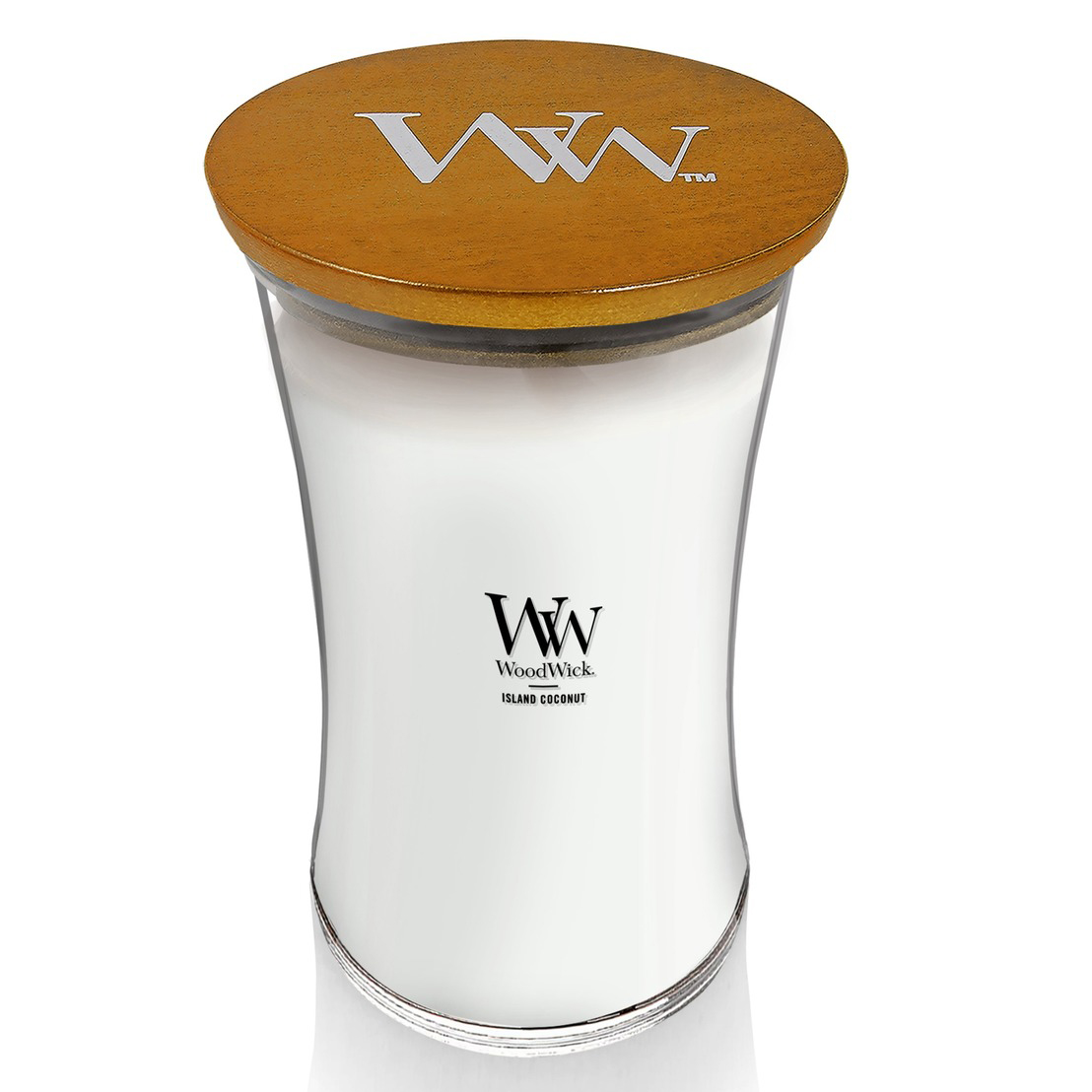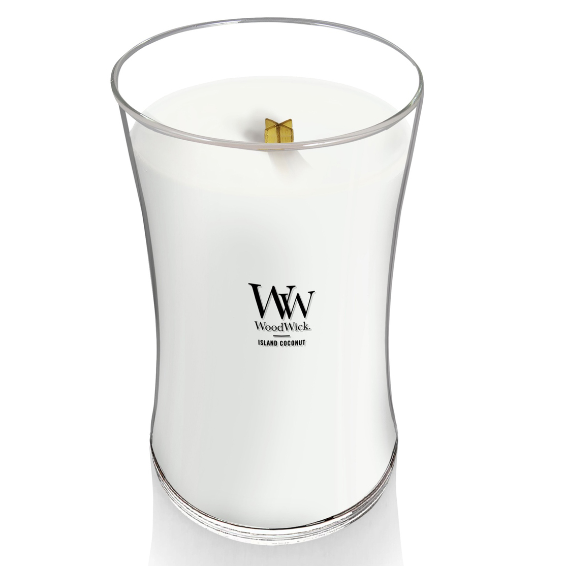 A candle from the renowned Woodwick company known for scented candles. Notable features include: