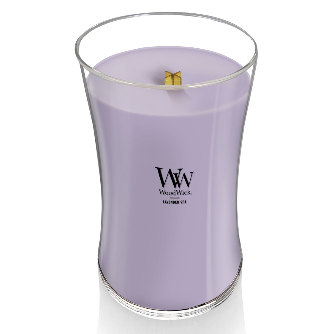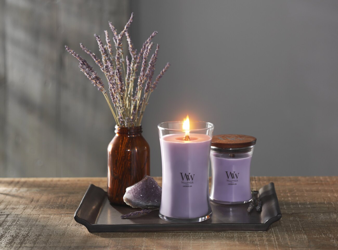 A candle from the renowned Woodwick company known for scented candles. Notable features include: