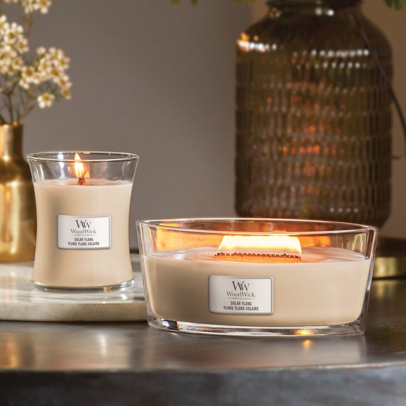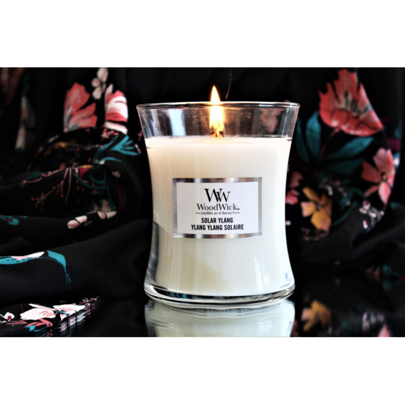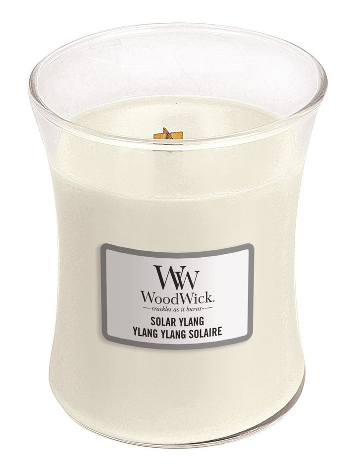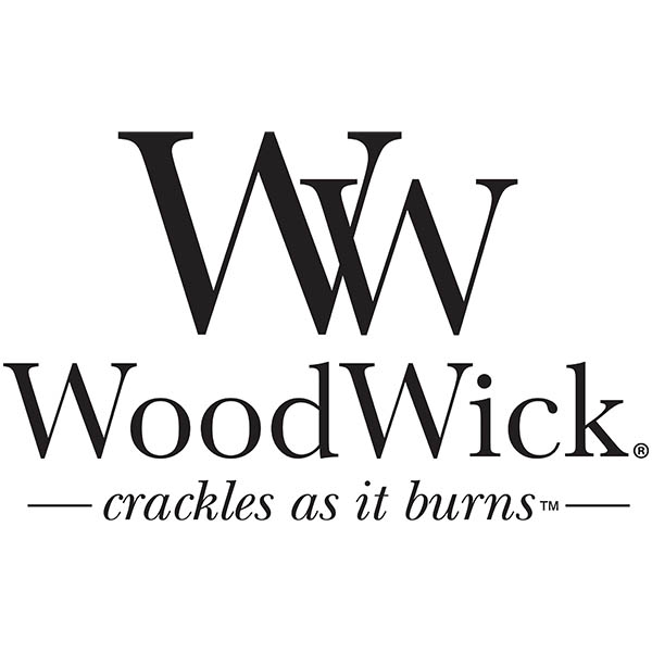 A candle from the renowned company Woodwick, known for its scented candles.