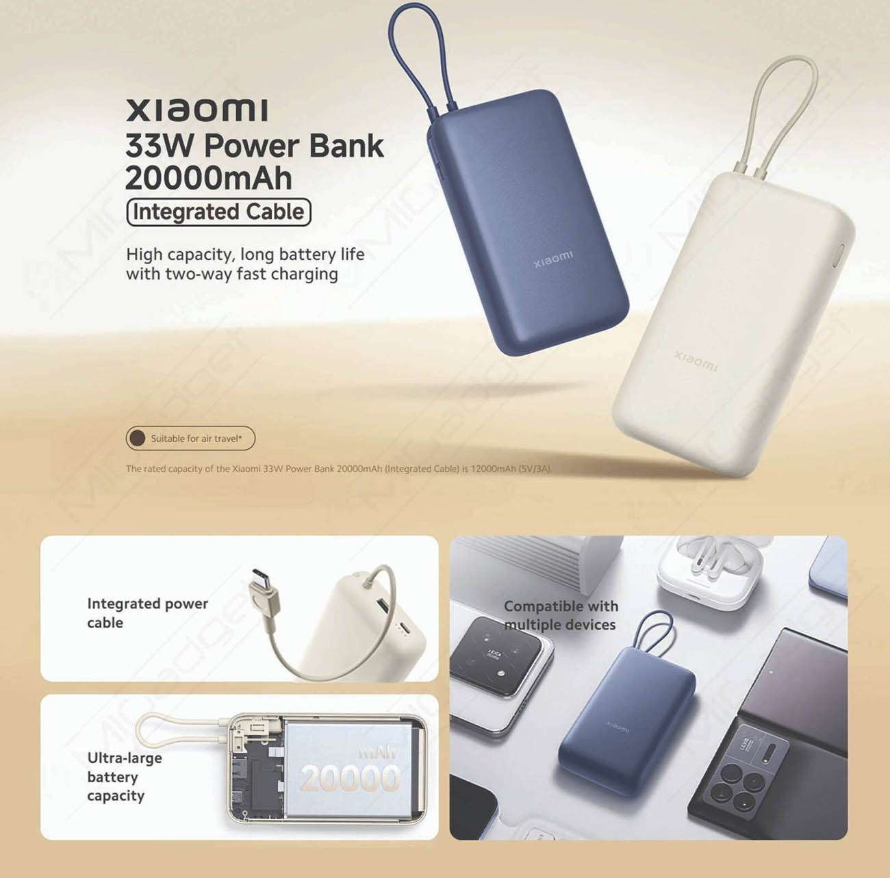 Xiaomi 20,000mAh Power Bank / Type-C + USB-A Ports / Built-in Type-C Cable / 33W Power / Blue in Qatar