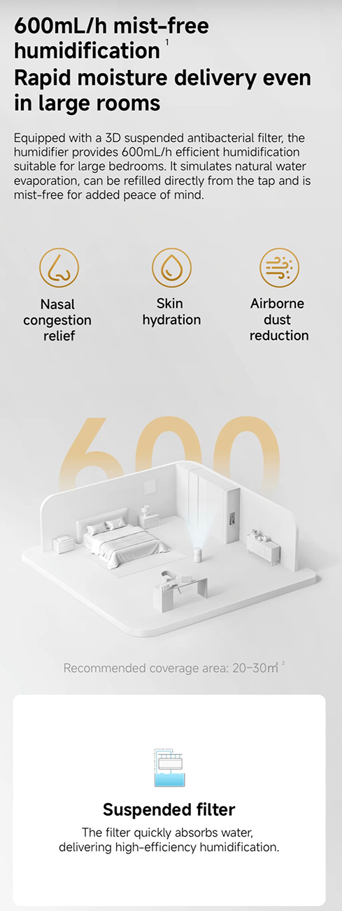 Uses evaporative humidification technology to naturally and effectively disperse moisture into the air.