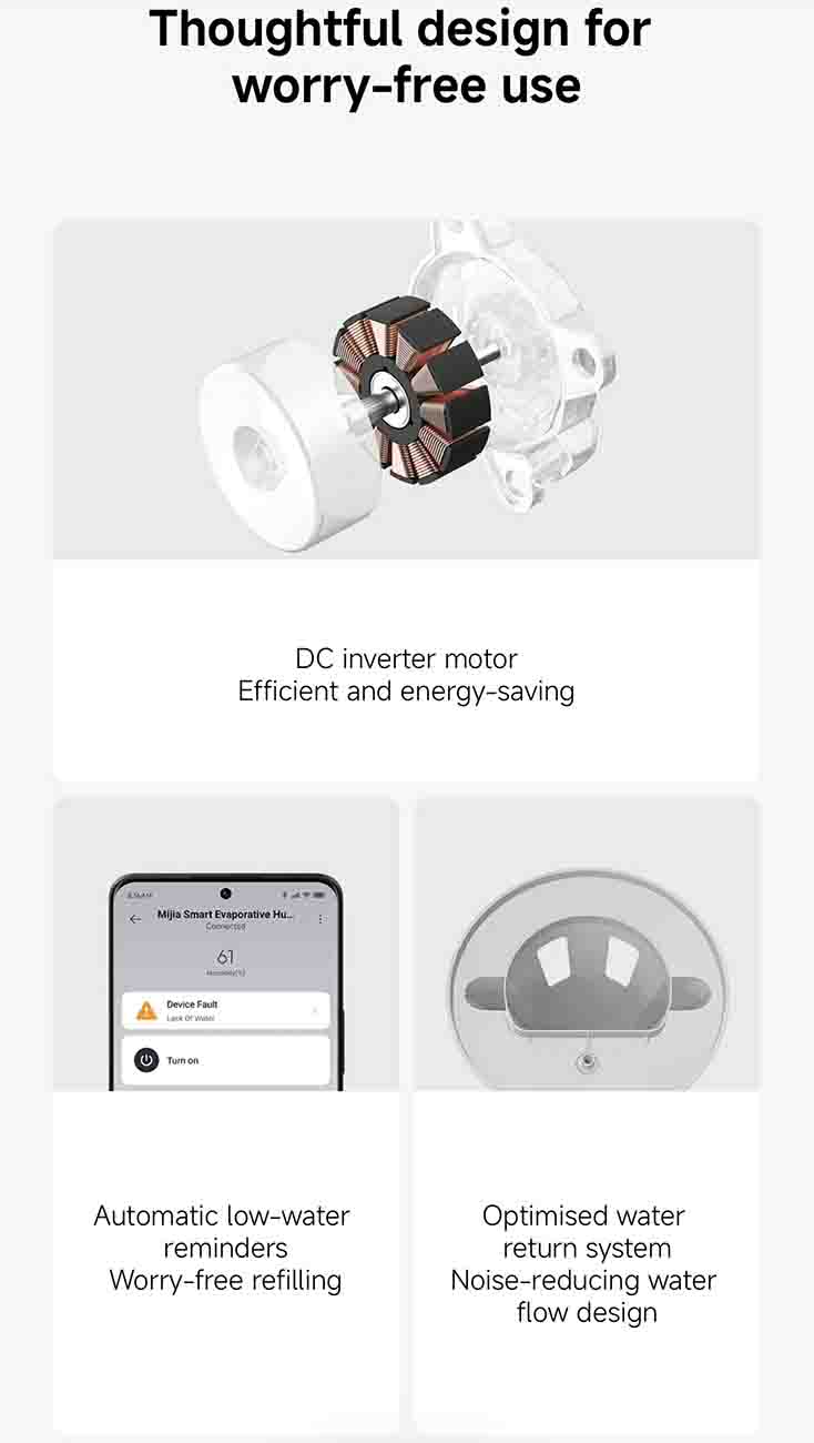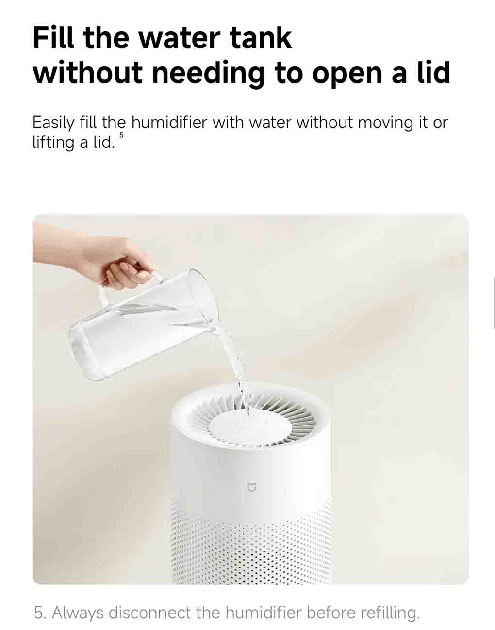Equipped with an anti-bacterial filter to purify the water before evaporation.