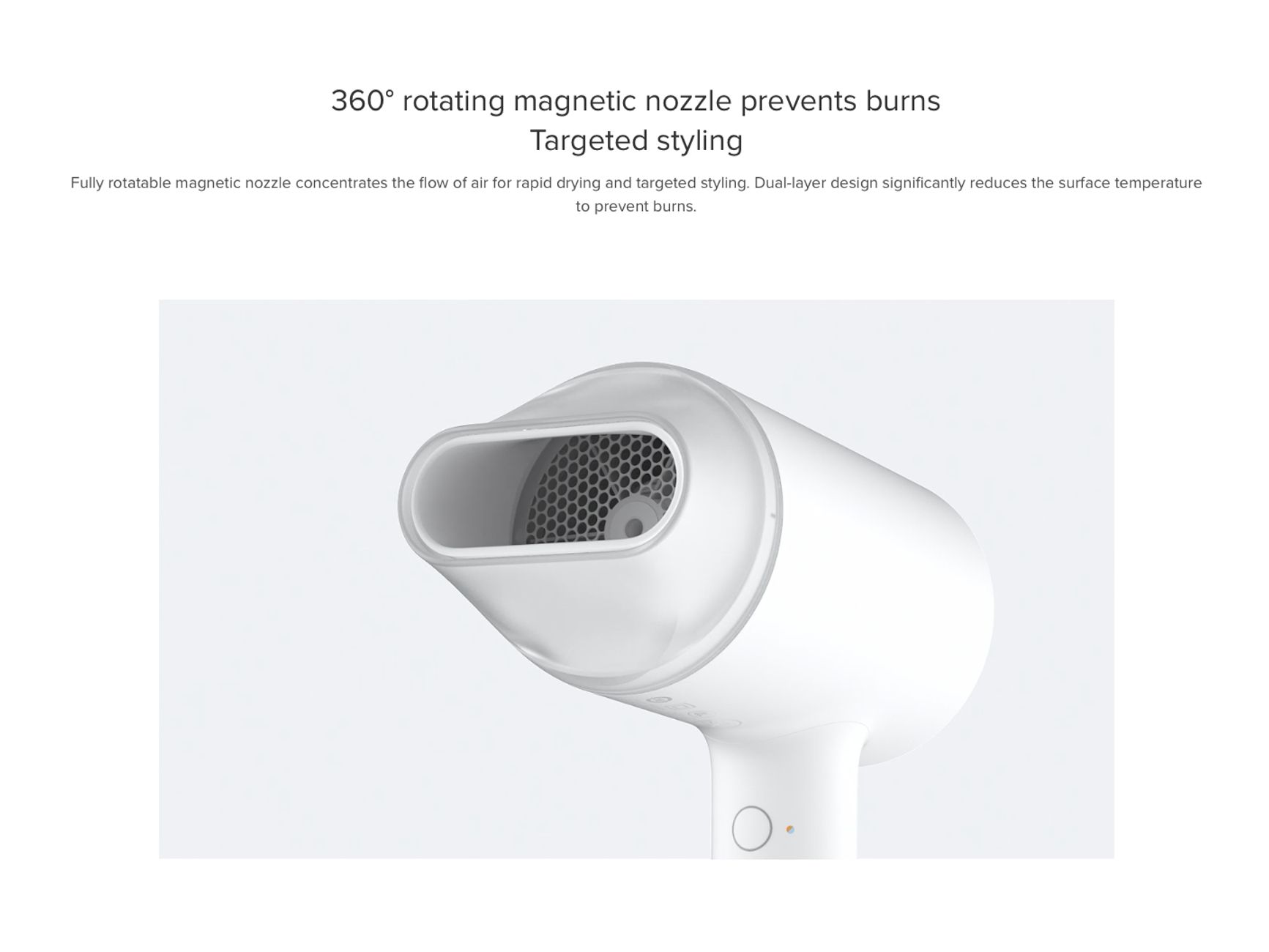 360-degree rotating magnetic nozzle for targeted styling and prevention of burns.