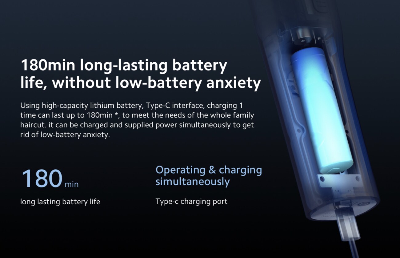 High-capacity lithium battery lasts up to 180min on 1 charge and supports simultaneous charging and power supply.